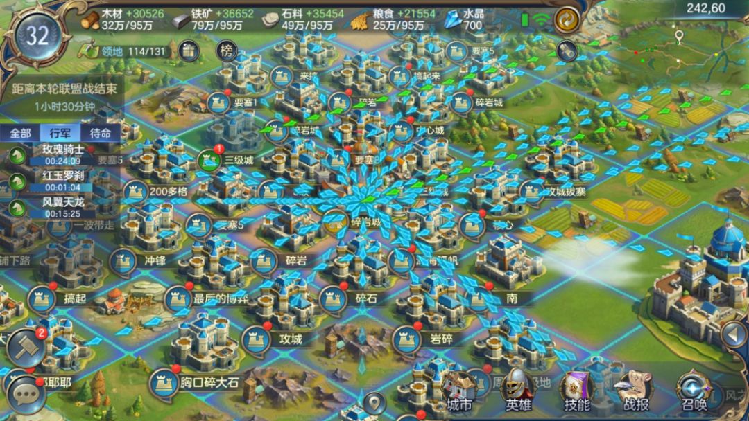 匹配切换地图后,双方反应迅速,很快部署了铺路小队快速铺向各自出生区的城市以及资源州关口,因此双方联盟能在短短两天时间内完成了占领出生区城市+破关进军资源州的战略目标,如此快节奏的攻城安排是第一轮联盟战所没有体验到的,很多初次尝试SLG游戏新手都感觉快跟不上联盟进攻节奏了。