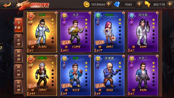 游戏角色分为攻击型、防御型、智力型以及医疗型,比如山鸡就属于攻击型。每个角色都有属于自己的专属武器,通过升级就能获得更加强大的力量。玩家在出战前要先依照角色类型,把他们放在阵形中有利位置。例如攻击型就可放到最前。玩家亦可按“一键最强”让系统选出理想排位。