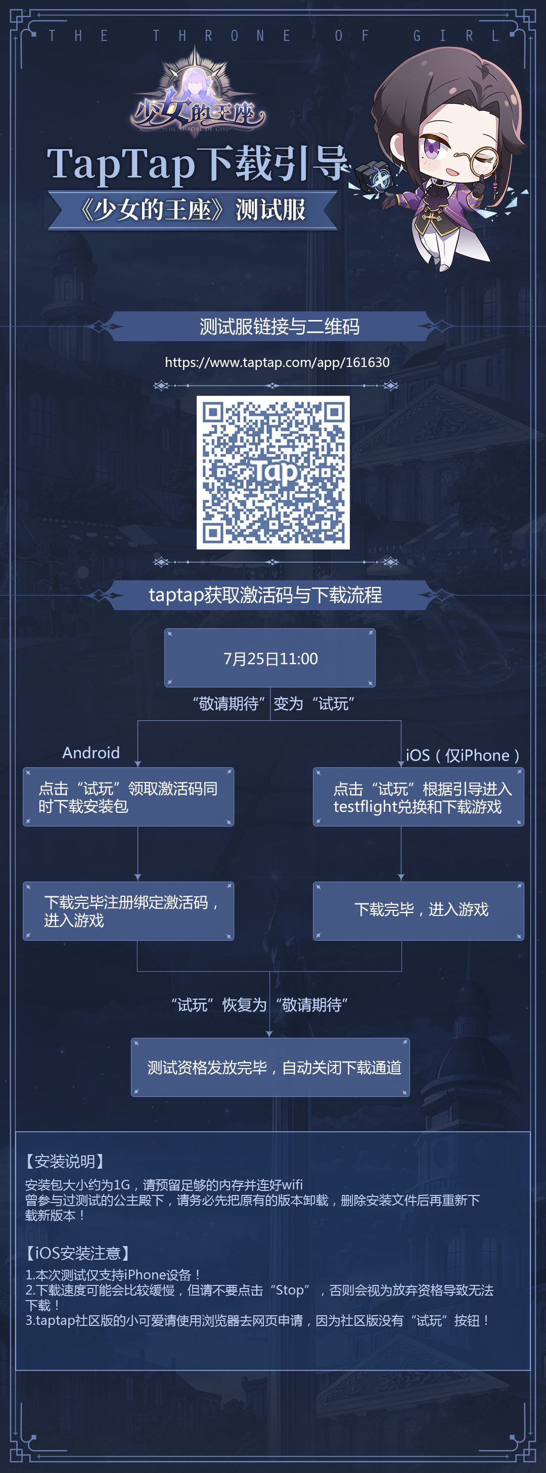 【iOS资格获取途径】《少女的王座(测试服)》开放下载期间,点击“试玩”会出现引导下载或唤起TestFlight,根据tap自带的引导操作下载安装成功即可进入游戏,不需要激活码。iOS测试资格发放完毕时会自动关闭下载通道,对应“试玩”按钮恢复为“敬请期待”,同时会发布IOS激活码发放完毕公告。