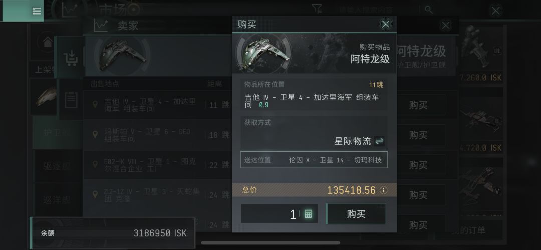 当你选择买什么货物的时候,打开左上角的头像,选择市场,市场里面设置选择显示全部货物,包括不存在出售的,当你点这个货物的时候,它就会显示它分别在哪个星系哪个空间站有出售,就像是第二幅图。当你选好了自己想要买的东西后,只需要点第二幅图货物位置后面的购买即可,就会出现第一幅图,上面这个样子。