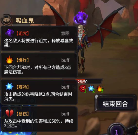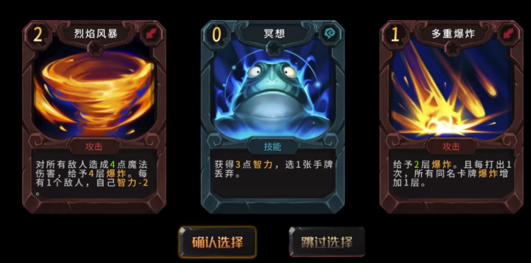 同时,法师冰铎还可以增加【爆炸】和【寒冷】。【爆炸】在攻击回合结束后给所有敌人加上相应点数伤害,【寒冷】会让敌人造成的伤害降低。
