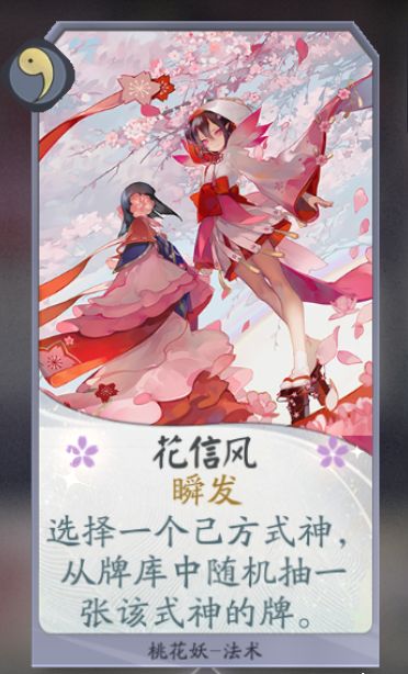 如果没有两张桃华灼灼,其中一张也可以考虑换成花信风,花信风能够针对某个式神拿牌,有时候还是挺关键的。