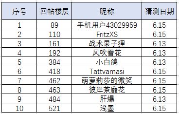 本鸭认真从几百个回复中抽取了竞猜日期最接近的10名小伙伴,分别是: