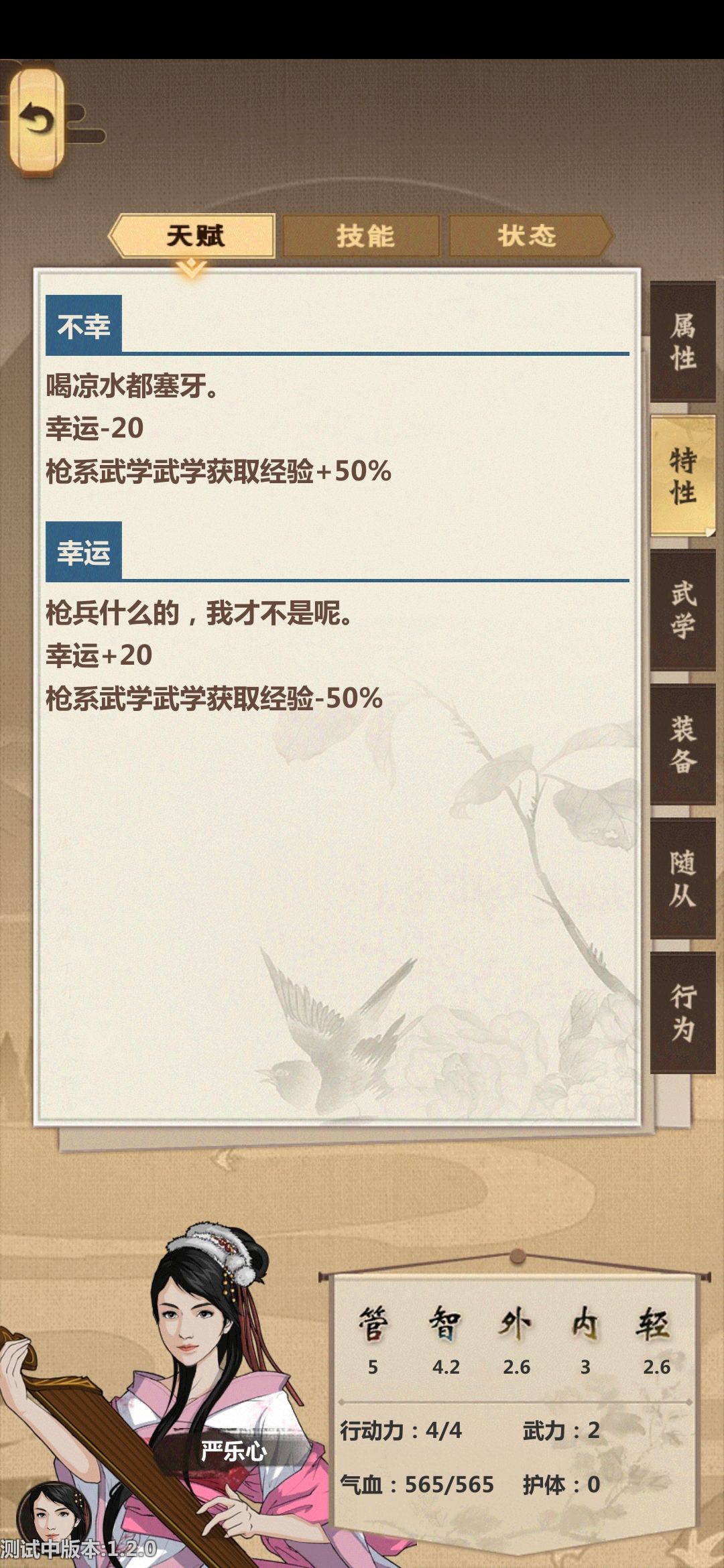 建议特性可以加一个矛盾逻辑,不然一个轻功甲结果特性断腿,还有这种样子的,有一丢丢搞笑