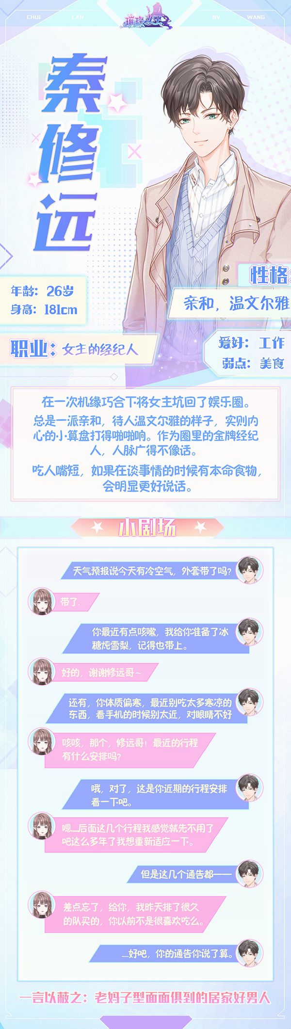 今天我们来八一八女主的经纪人,同时也是女主的好友--秦修远