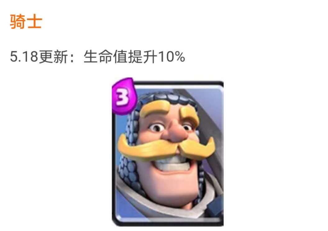 ​可以看到当时骑士虽然生命值比现在低但是攻击速度比现在快,不过伤害不能秒杀哥布林还是让他变成了一张卡手的卡牌,防守能力远远低于现在,高端局基本看不到。2月9日,武神的攻速加快,这导致骑士的使用率降低不少,相比他玩家们更喜欢用生命值更高而且有范围伤害的女武神。不料武神后来不仅没削,3月23日官方还将武神的生命值和伤害提升了10%!这一项调整使骑士完全失去了自己的地位,变成了实实在在的废卡。好在官方发现及时,于同年5月削弱了武神,使她可以被火球火箭击退;同次调整还提升了骑士10%的生命值。这两项调整很好地将骑士和武神的使用率和胜率拉进了不少。从此骑士这张卡牌渐渐平衡了起来。