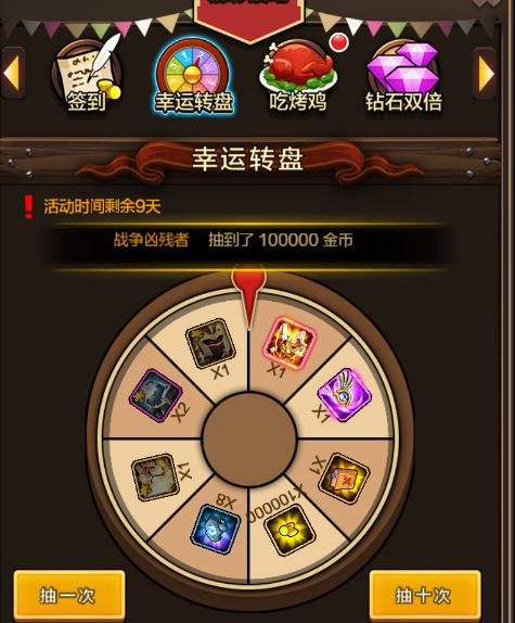 幸运转盘中设置了很多的奖励,其中就有10W的金币奖励。