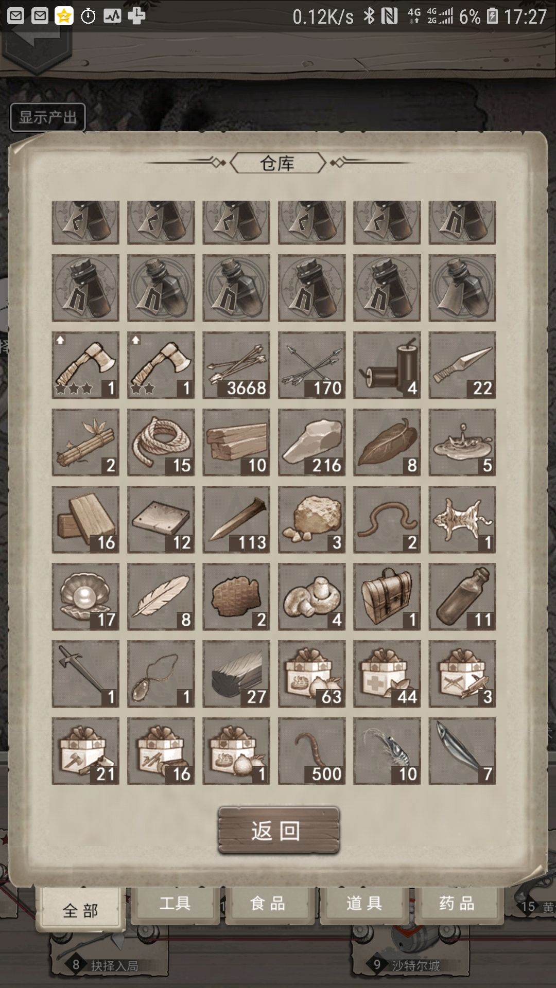 就是这样,屯了300绷带(重量2价值5)200石片(重量2价值3)3600箭矢(重量0.2价值0.6)11熔岩药剂(价值20)200肉片(重量1价值1.5)