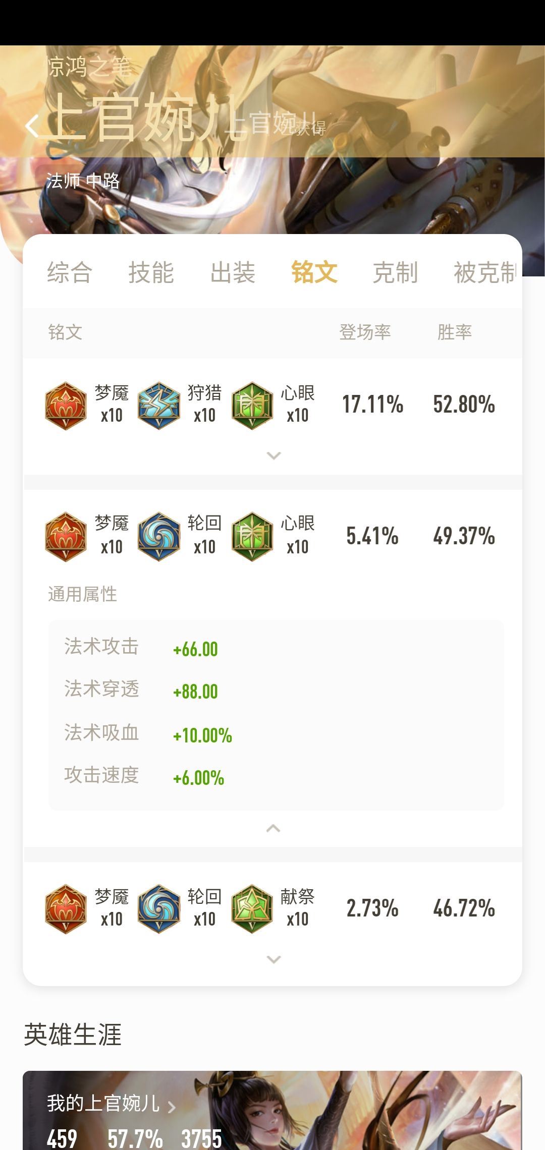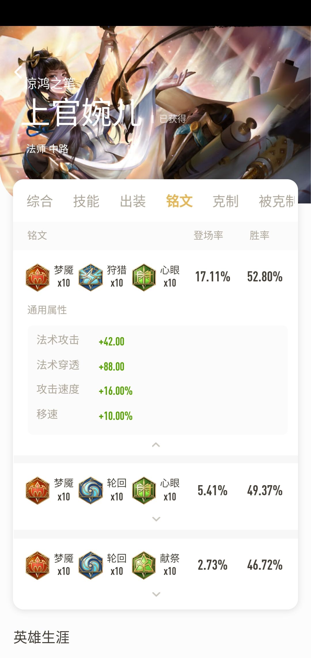 此铭文为上官最基础的铭文,提供了上官所需要的攻速,和法术输出。另一方面10%的移速也可以让上官更快的进行支援。