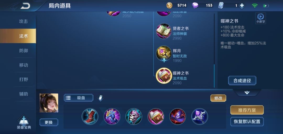配合轮回,利用高吸血和高法穿打出爆炸伤害。吸血书放在后面是为了保证前期能有一定的低保输出。法杖不要换成大书,不然法强溢出缺少法穿是很难对敌方坦克造成大量伤害的。
