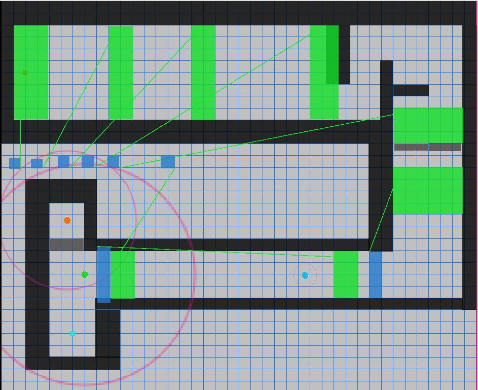 然后这是第二关,绿色的是控制对应蓝色墙体的钥匙,所以你去杀第一个弓箭手(中间底部的绿点)的时候,必然会触发后面那道门,把里面的敌人放出来。