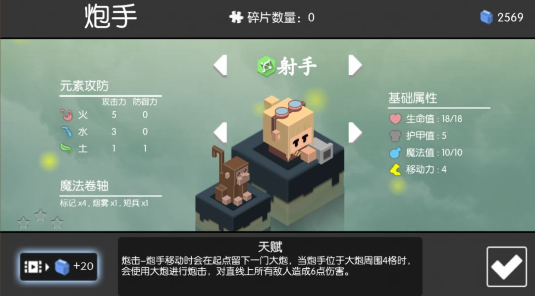 炮击-炮手移动时会在起点留下一门大炮,当炮手位于大炮周围4格时,会使用大炮进行炮击,对直线上所有敌人造成6点伤害。