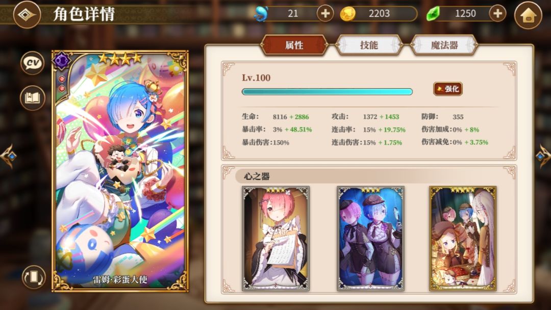 心器推荐暴击,回怒气,大招伤害(识字,归途,探案姐妹)魔法器推荐骰子,因为被动的原因所以怒气集赞非常快,不需要石峰。