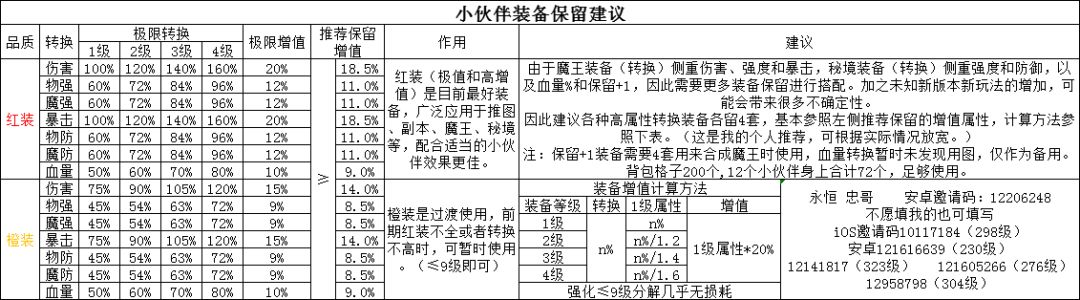 同时附上我自己做的装备保留统计表(含正在使用的),仅供参考。