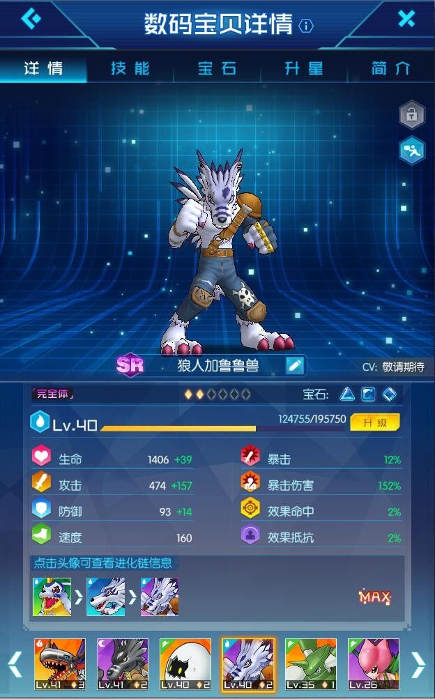 好在我的技能使我轻松不少,其他数码宝贝,你们必须行动,必须放技能才能加buff,才能硬。而我只需要在那儿一站,瞬间提升队友攻击力。据说有一个黑货模仿我的脸,模仿我的面,但我的魅力是他永远模仿不来的,我在那儿一站,队友就能硬;而他一站,对面见了都会软(黑狼人加鲁鲁每回合减少对面5%的血量)。