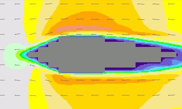 在阻力方面,我们增加了本身水体的流体阻力,并重新定义了船只水线处的兴波阻力、涡流阻力。模拟示意图: