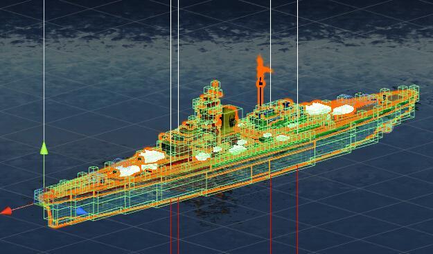 此外,对于船只的浮力及自身平衡等,我们也进行了改进,尽量还原船只真实情况,考虑到游戏优化,我们并不是单独计算每一个零件的受力,而是将他们以相对位置为依据进行积分。如该测试舰的受力分析,不同颜色代表其相对于重心的作用方向。红白线条代表最终的积分运算模拟结果。