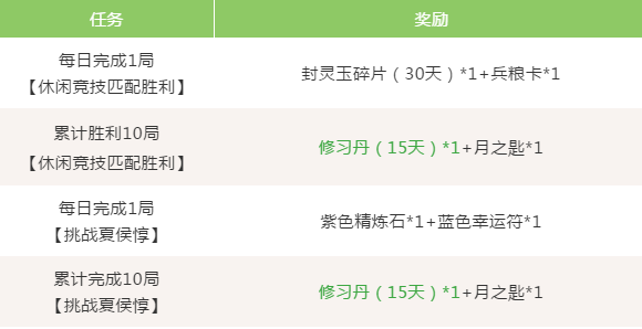 2、累计完成10局【军团出征】,可获得修习丹(15天)*1、月之匙*1。