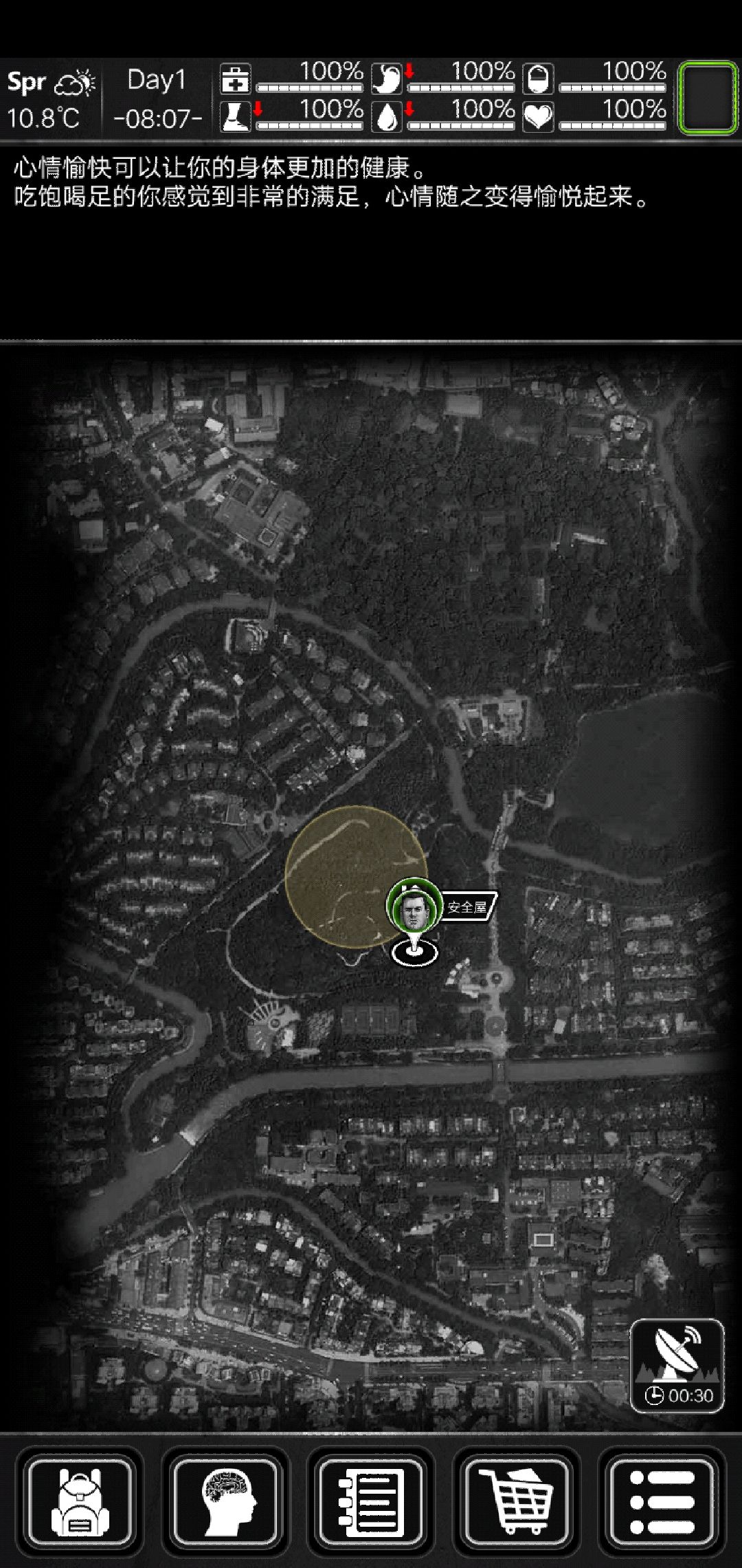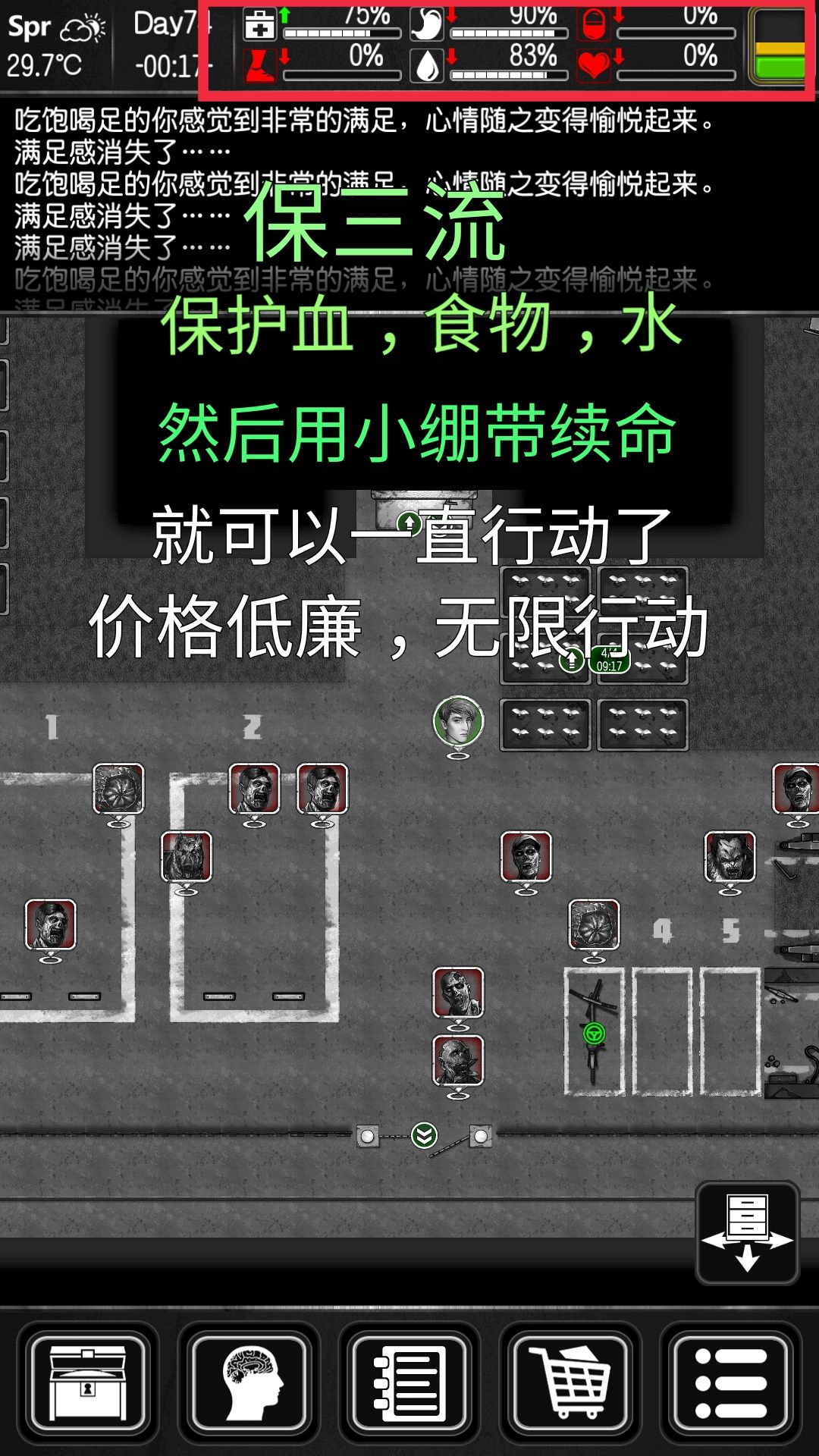 然后,在前期尽量先把田和污水机做出来,这样就不怕缺食物了,前期最好不要去医院,虽然收益高,但是容易死,不划算,