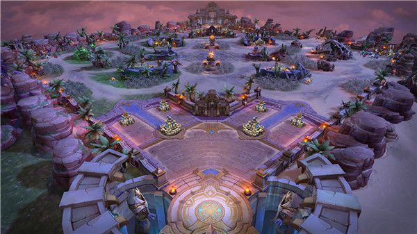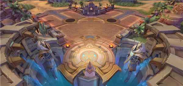 与2V2全新模式一同公布的,还有全新的2V2竞技地图。地图面积适中,但玩法丰富程度与3V3相当——地图上沟壑纵横、阡陌相连,英雄可以借着草丛、岩石、建筑等隐藏身影,悄然前往交战地点,予以支援。全图共有8处绿色野点、6处黄色野点、2处红色野点和圣甲虫、沙漠之王2个顶级野点,野怪实力和击杀后的奖励依次递增。其中绿色野点只掉落金币,其他野点会掉落装备和属性书,击杀圣甲虫后可获得群体增益buff,击杀沙漠之王还会掉落统治之刃,可用于召唤沙漠之子协助作战!