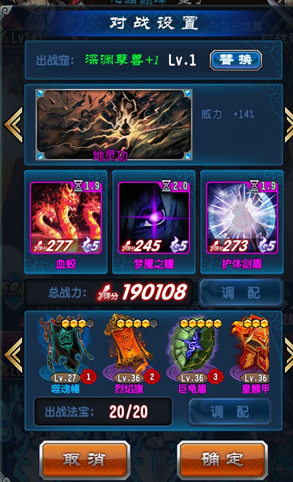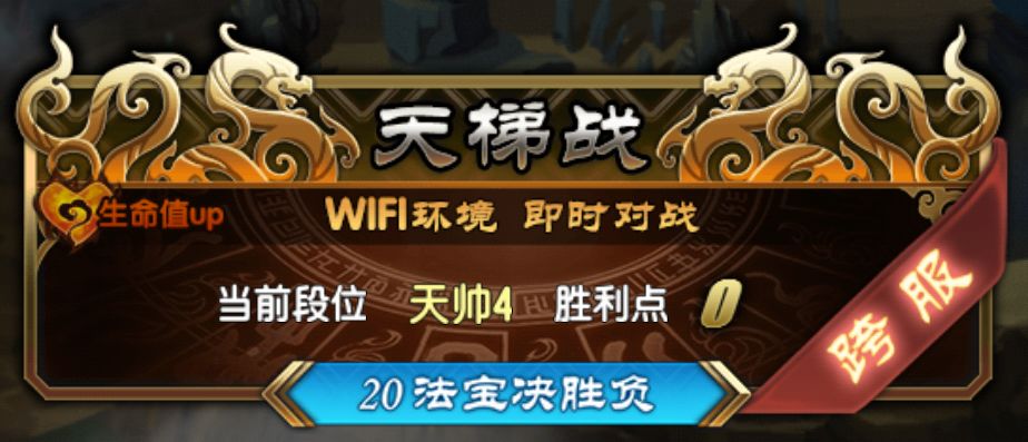 双方生命值提升,双方各选择拥有的20个法宝进行排序,法宝不能增加,法宝的出现顺序完全按照你的排列出现,双方各选择三个神通,娱乐模式里面神通可以随意选择,排位模式双方可以禁用两方加起来的三个神通,可携带宠物,准备结束前可以更换功法,其中一方掉线另一方自动获胜,没有其他因素的情况下率先血量归零的一方失败。