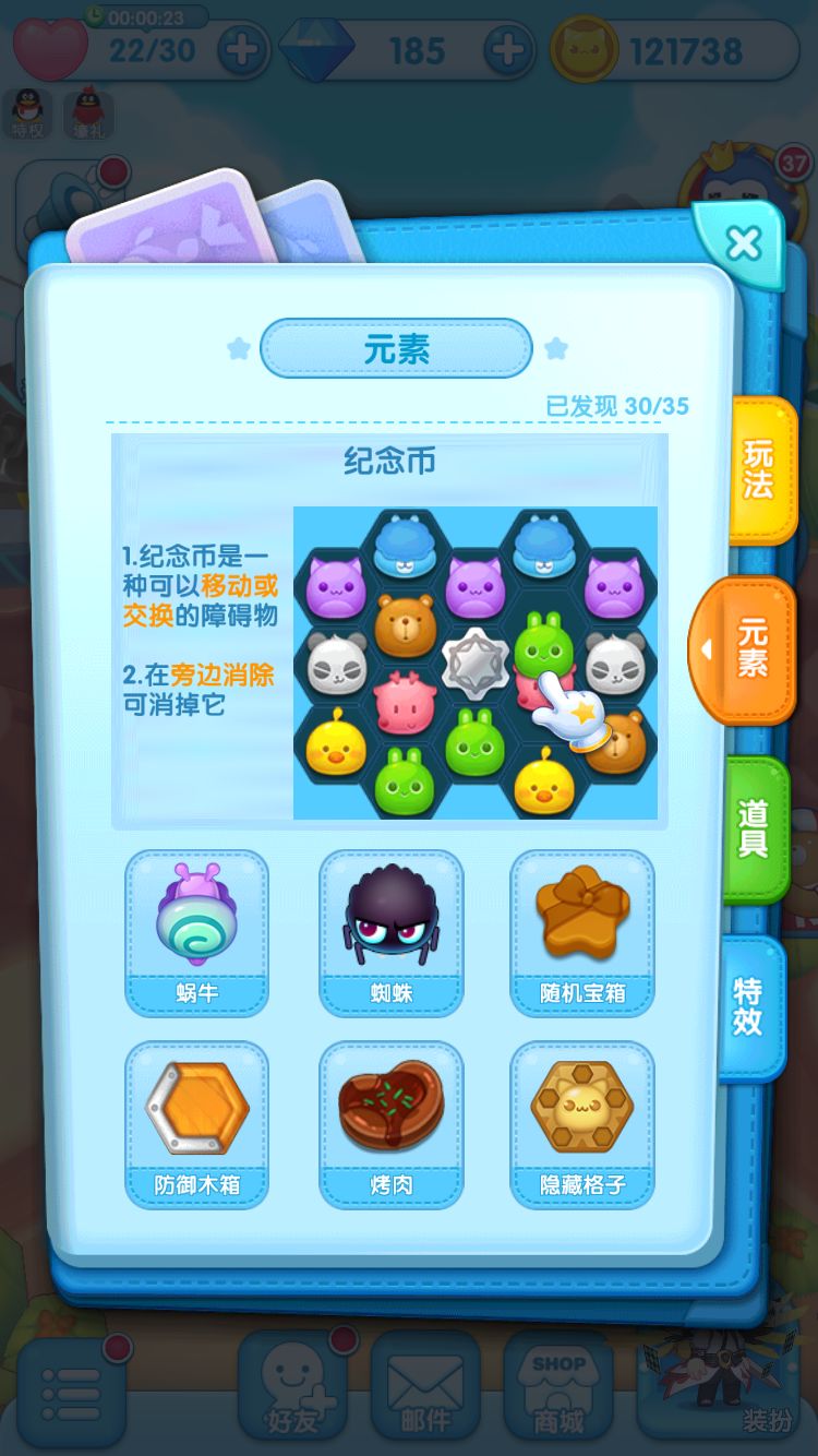纪念币元素在关卡、周赛、段位赛等等模式中均有出现,小伙伴们对它应该不会很陌生。它经常出现在一些地图上的关键位置,用于封路。纪念币元素有几种消除方式:在它的旁边进行消除其他棋子来消除它;使用特效炸弹攻击消除它;激光炮的激光来消除它。其中特效炸弹消除它是比较特殊的。