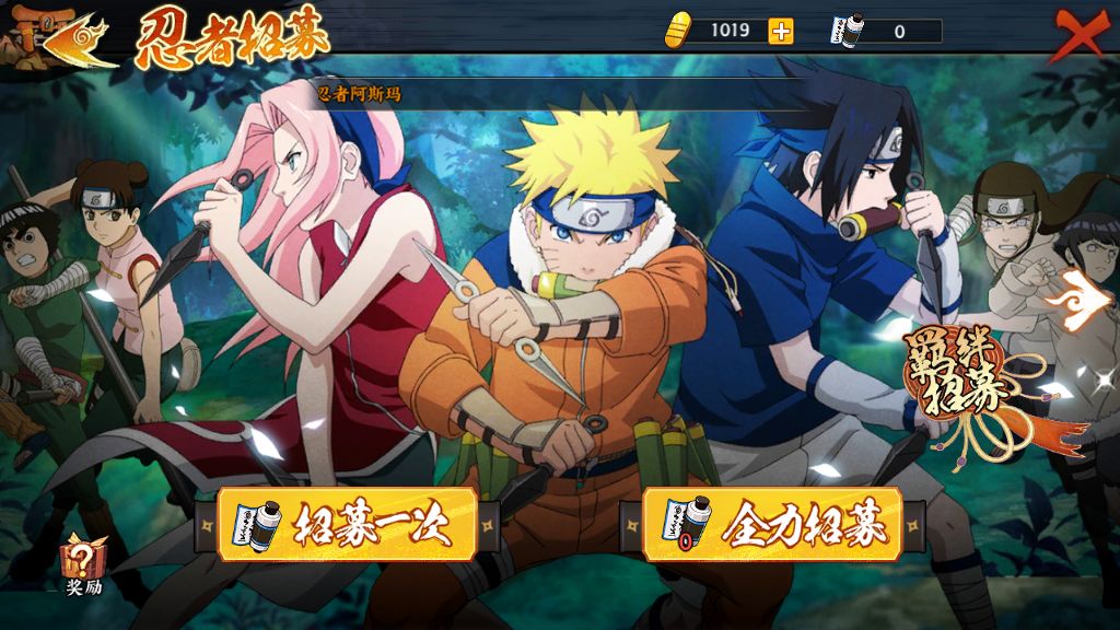 封印招募是有一定概率出完整忍者的,也有一定概率是出角色碎片,当碎片达到一定数量时就能召唤相应的忍者了。如果抽到完整忍者的话,效果是完全不一样的,每次十连看到卡片背面的时候就特别紧张,SS?S?然后点击卡片就能知道结果了。我也当过欧洲人的,单抽出奇迹,十连卡卡西!不解释,嘚瑟一分钟。至于角色收集方面,当完成每个卷轴对应的收集是能对战斗力有加成的。