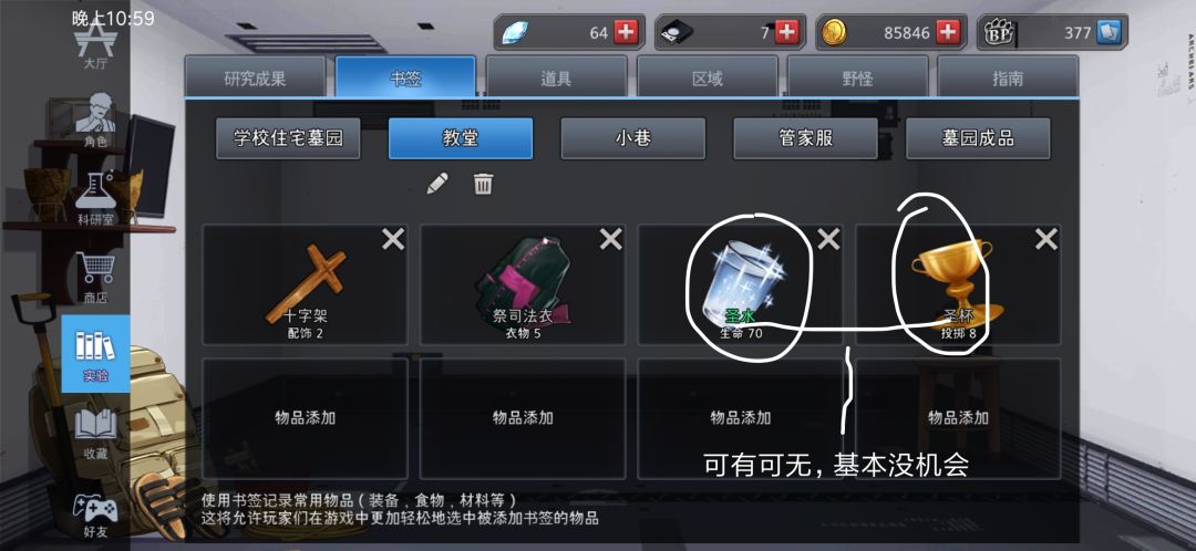 教堂(最最最重要的地方):十字架,十字架,法衣,法衣,十字架,圣杯,圣水(有就捡着,可以换面包)