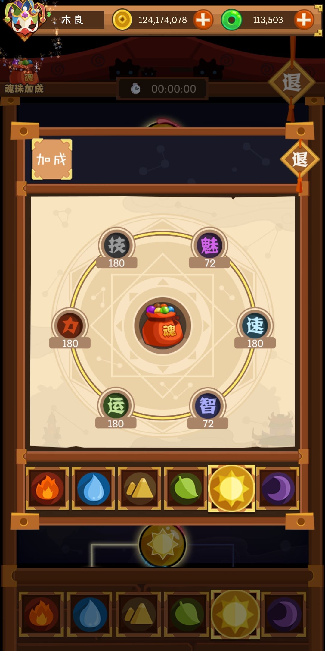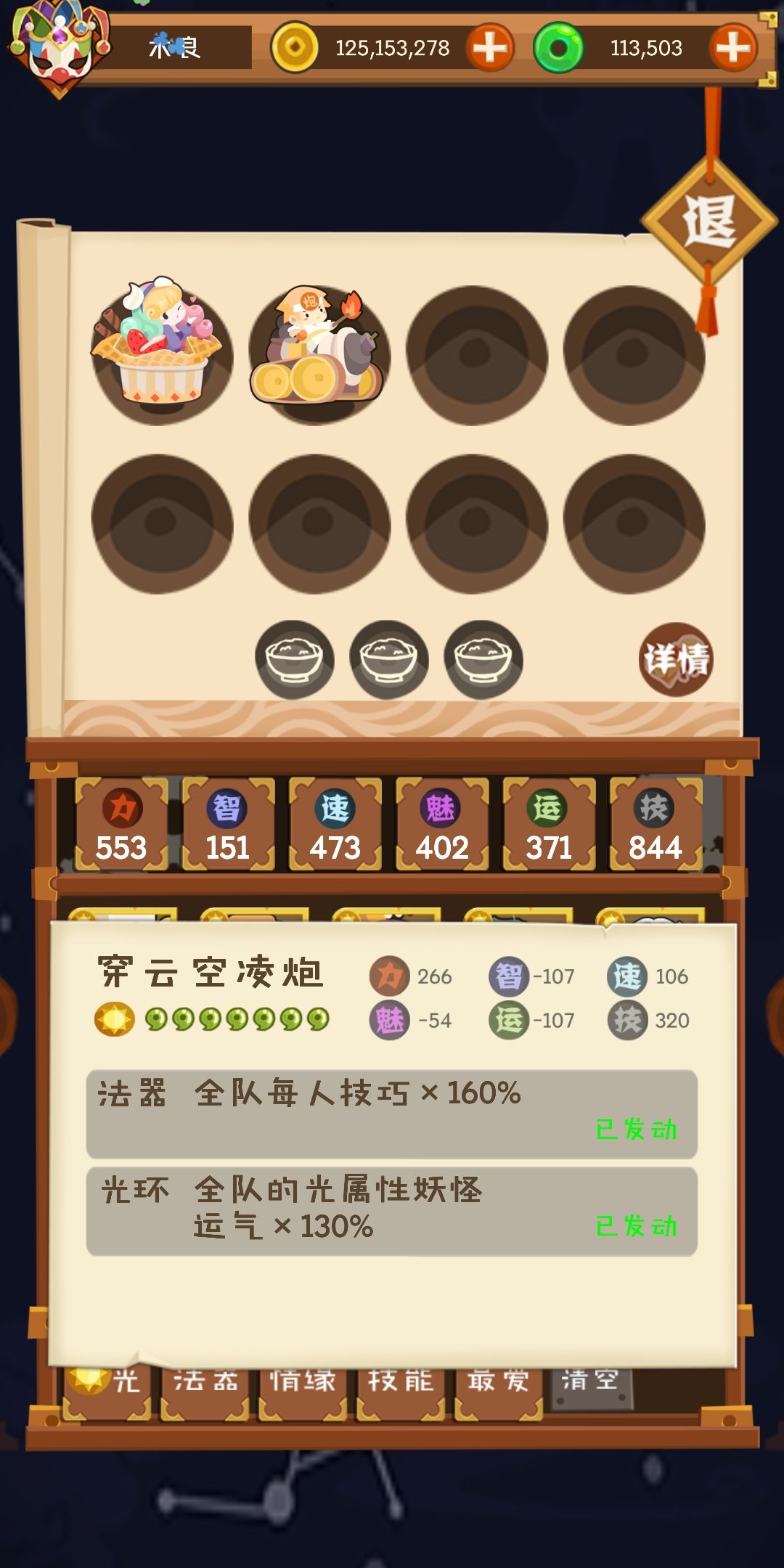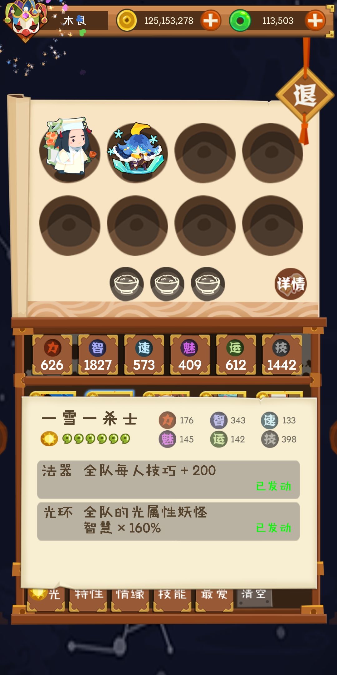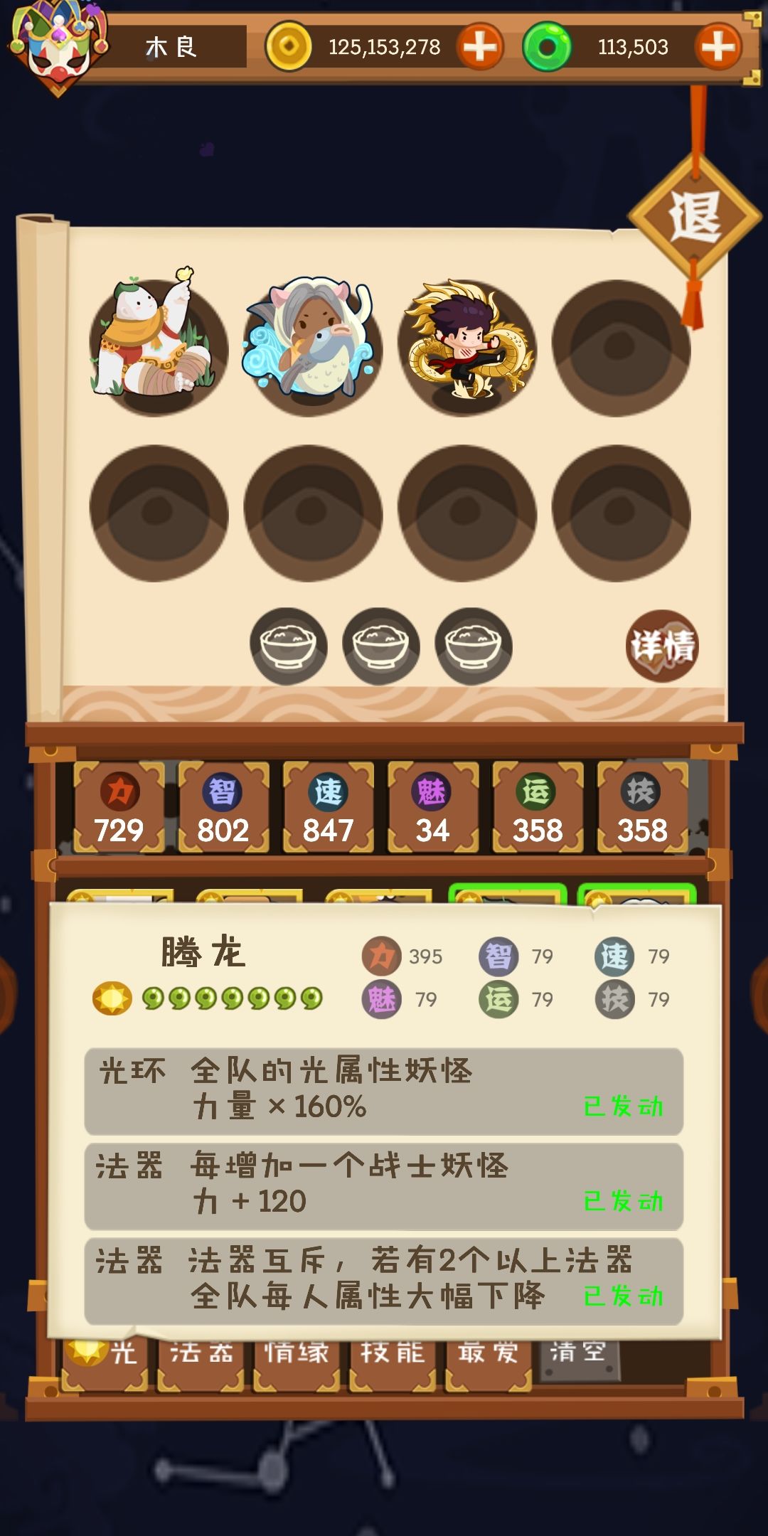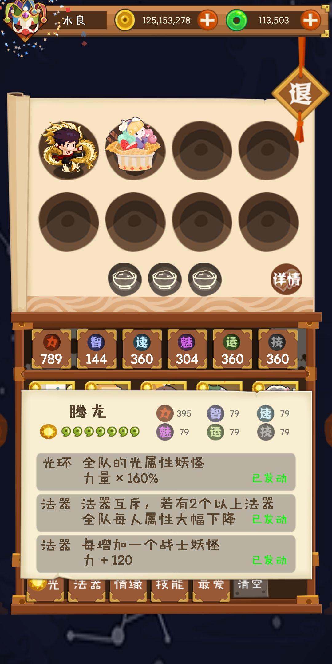 ——————————华丽的分割线——————————选材原因:选用的都是光系的妖怪,数量多而且技能多变。魂珠加成:智72、魅72、力180、速180、技180、魅180、运180。