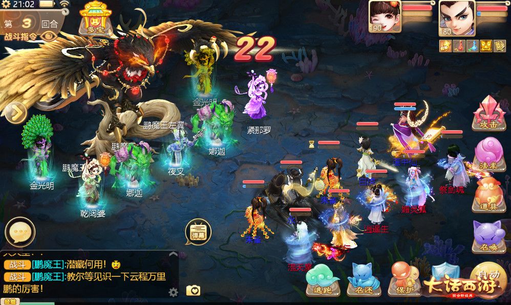 当战斗进行到第三回合开始后,鹏魔王将会吞噬两侧小怪,并现出大鹏鸟真身。