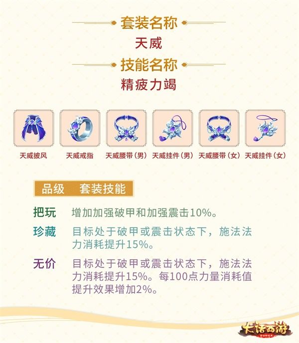 四款套装激活后的强大技能效果也不容小觑。在这四款全新套装之中,“战意”的技能“攻无不克”与“天威”的技能“精疲力竭”都侧重提升角色的输出能力。其中“战意”套装的技能效果较能直接提升输出,除了能够增强角色本身的扫击属性之外,击杀敌方召唤兽还能增加一定的自身生命值和攻击力。 而“天威”套装技能激活后可加强破防能力,并且在目标处于破甲或震击状态下时,还能增加敌方法力消耗。装备以上两个套装,能够大幅提升侠士们在战斗中的输出能力,帮助大家更快取得战斗的胜利!