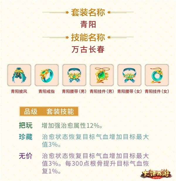 而“沧海”套装的技能“安适如常”和“青阳”套装的技能“万古长春”则侧重提升战斗中角色的治疗能力。“沧海”套装的技能效果除了恢复目标气血,还同时能够恢复目标的最大法力;“青阳”的技能效果则是提升目标受到的治愈效果。装备这两款套装,都能够大大提升角色在战斗中的生存能力,超强力的技能治愈效果,将为战局带来更加多变的可能。