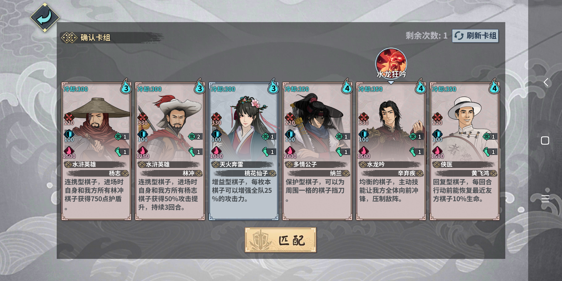 这套卡组低费,而且很稳,前期攒9到10格能量,如果对面先过来就攒10格,对面不先手就9格。攒9格和10格是因为桃花跟辛弃疾的关系。杨志跟林冲是这套卡组的主要输出!必须出来,一定要林冲先出,后杨志,这样林冲就可以享受护盾,让杨志享受输出没有盾来得强,因为杨志很多时候打不到人,而林冲却可以。如果对面先手可以让对面进入基地射程,攒10格出辛弃疾很快就可以技能过去,桃花只要被动就可以,不需要上战场,如果可以,我还希望她别上。如果对面不放就可以桃花先,先看看对面什么卡组,如果你还是辛弃疾水龙狂吟的话,对面攒的能量很快就让你全军覆没。这个如果对上上面第一套卡组的话,就难搞了,要时常备一个纳兰,这样就会少很多能量,所以要先探出对面的卡组,如果是第一套直接投降还是比较好的。