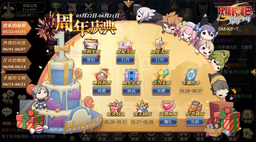 ★ 妖尾已经一岁啦!不知不觉间,妖尾已经陪伴大家一周年了,在这片美丽的阿斯兰特大陆上,魔导士们一同冒险,一同欢笑,走过了一段波澜壮阔的难忘旅程。庆典的鼓声已经敲响,狂欢的人们走上玛古诺尼亚的街头,庆祝这个属于我们共同的节日!公会联盟举办了丰富多彩的周年活动,下面就来一睹为快吧~