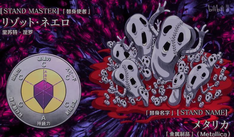替身能力:体型极小的成群替身,侵入对手体内分离铁质,重组成锋利型状物体排出体外,直接进行攻击或使对手缺铁死亡;并可覆盖本体产生保护色,隐密行踪