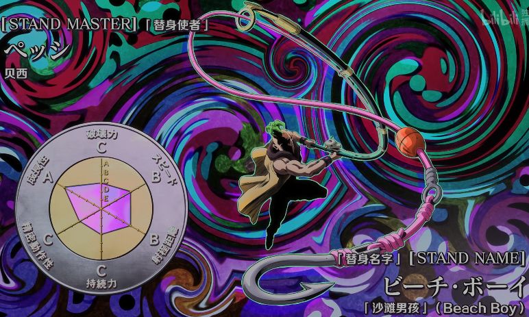 替身能力:钓勾与钓线可穿透物体直接勾取或攻击目标。可以在钓钩上装诱饵,借此设立陷阱,钓勾可以感应附近的生物气息,攻击钓线会把攻击转移到钓勾上释出