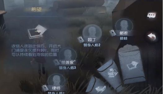 因此开局最好先查看一下拥有什么信件,如果发现监管者远远的朝自身走来,可以送出信件并使自身在一定时间后获得对应的增益效果。