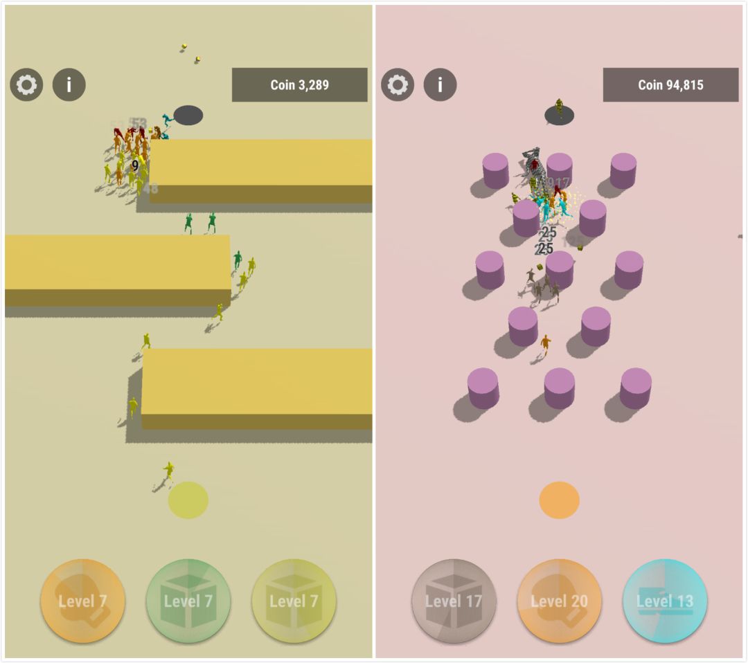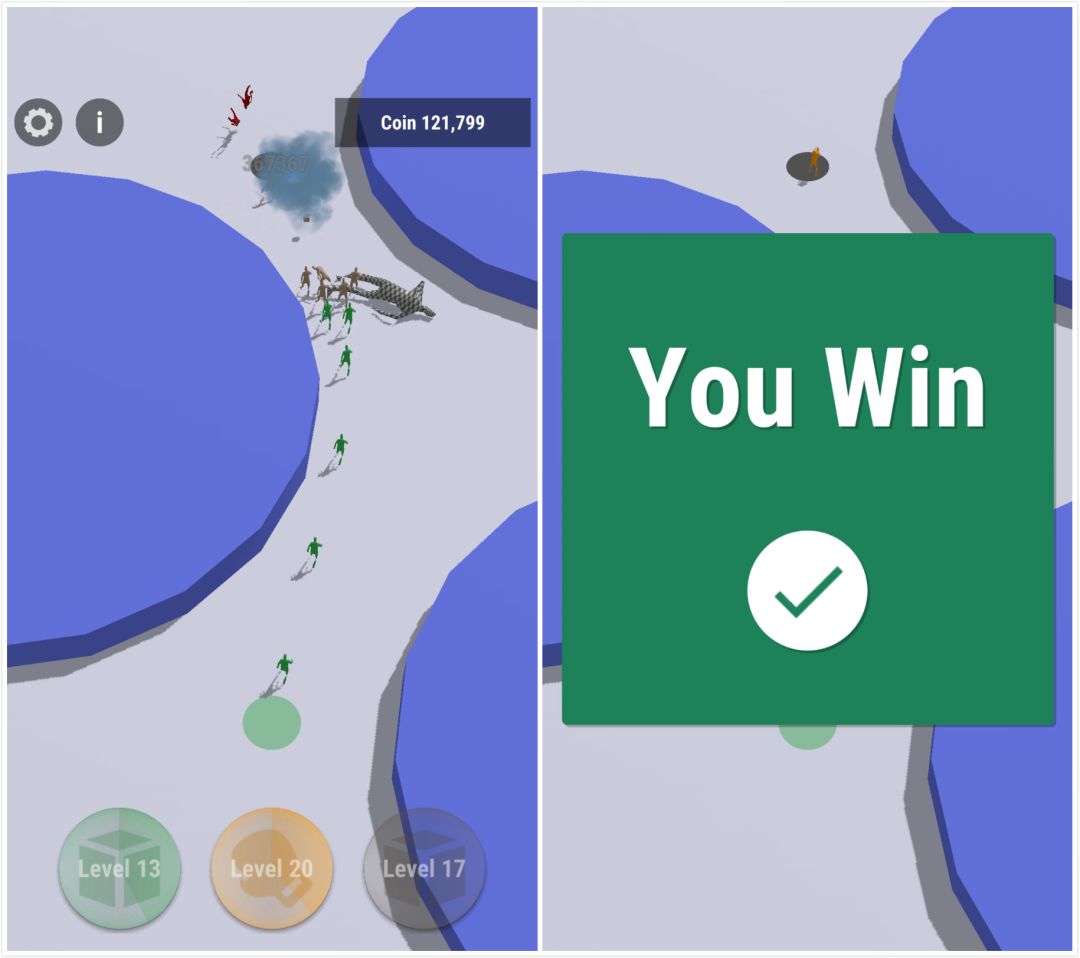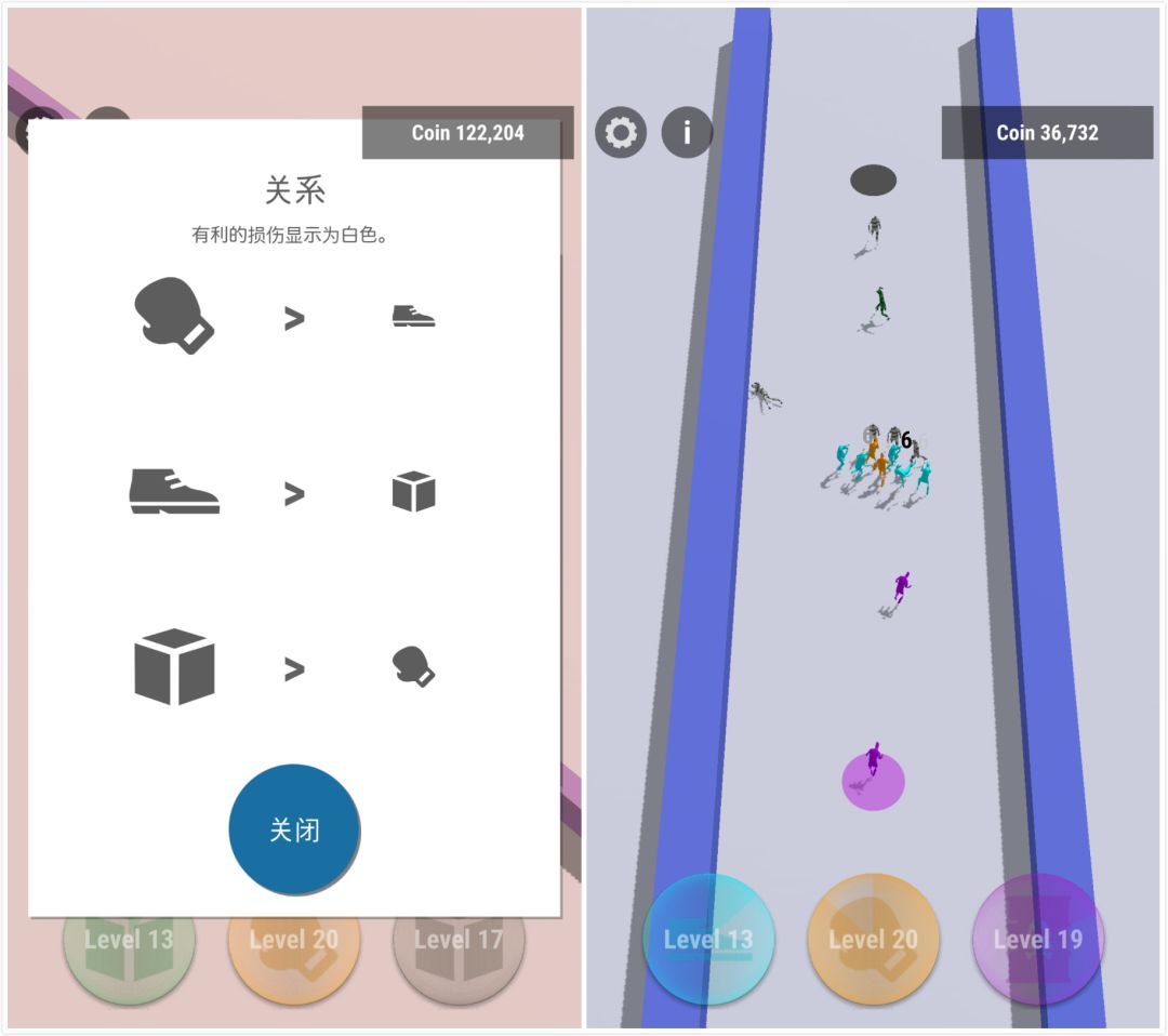 游戏中各种类型的人相互克制,所以在游戏一开始给出对方的出兵类型时,我们就可以根据万物相生相克法则和各种角色属性不同来决定好派兵和出兵顺序,基本上就可以躺赢了,角色也可以升级,金币不够的也可以在游戏中刷一刷钱或者是看广告,广告还是很良心的,可以快进不说给的也是真不少。