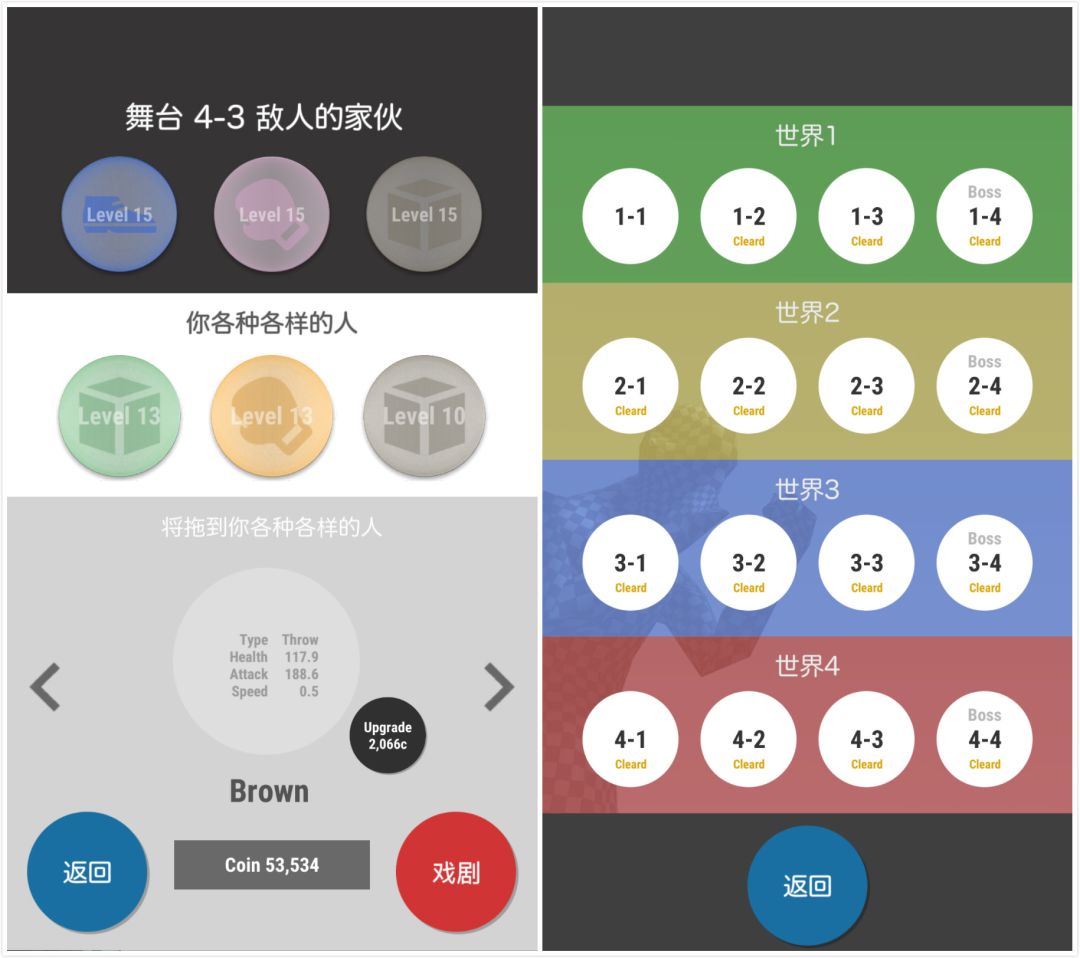 游戏中我们一共可以操作5种属性11个颜色的角色,看技能图标也可以猜到,分辨是用拳攻击,用脚踢,扔东西,爆炸还有一个肉盾,当然这些同种属性的角色也会有一些区别,比如速度,血量还有攻击力上会有不同,而且有的角色还会有一些特别的技能,比如Brown,一个方块丢出去附带雷击能造成范围性伤害,aoe啊有咩有,那酸爽,比不分敌我的小紫不知道强了几个level诶,深藏功与名。