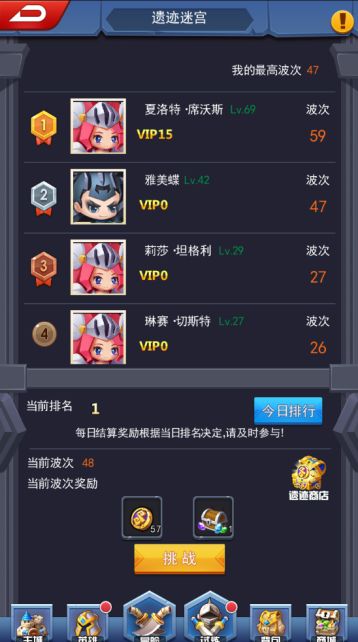 我们先来看下遗迹迷宫的玩法和作用。遗迹迷宫是获得宝石的主要途径。 遗迹迷宫模式是一种无尽模式的玩法,每波战斗时间60S,60s时间结束后剩余怪物数量超过20则挑战失败。完成可获得战功和随机1级宝石宝箱,战功可以在遗迹商店购买宝石和英雄碎片。通过挑战的波次给予排名,每天0点结算。