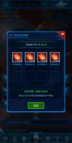 争相探秘星际宝库为的就是里面丰厚的图纸资源,如果一名与世无争爱好和平的种田党想在《银河战舰》星际宝库中有所收获,除了参加黑洞争夺战,还可以通过消耗功勋的形式,在黑洞用功勋征收争夺战积分。每次征收黑洞需固定消耗1600K功勋,成功征收的指挥官将随机获得200~1000点不等的争夺战积分。每天换一换,种田党们也能体验积少成多轻松兑换图纸,兵不血刃抱走满筐图纸的感觉!