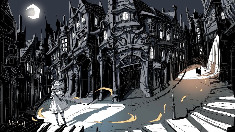 《Iris.Fall》的中文名称叫作《彩虹坠入》,是一款美术风格很突出的解密游戏。从玩法预告与概念设计图中可以看出,游戏的主基调是稍显黑暗的哥特童话,画面黑白对比十分突出,场景以及建筑的扭曲比例极为夸张。游戏中的小女孩就叫 Iris,从梦中醒来的她,尾随着一只黑猫进入了破旧的剧院,穿梭在光与影的诡异谜宫之中。