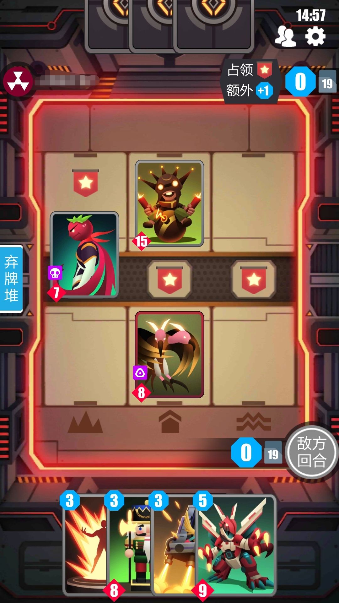有关游戏对战机制的说明,开局时先/后手能分别在抽出的6张卡牌中留下3/4张卡牌,第一个回合先手能获得3个能量点,而后手是4个。每个回合固定能获得3个能量点,并且能够储存到下一个回合,至于最多能储存多少点——暂时还没有办法测试出来,因为这个游戏的据点争夺实在太激烈了,一个回合毫无作为的话,很可能就没有下个回合了。