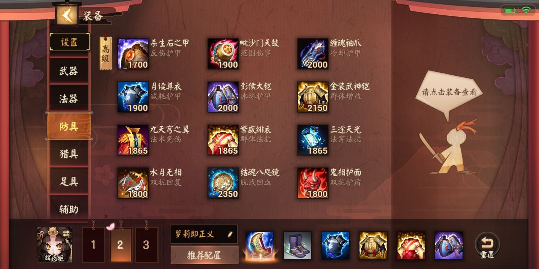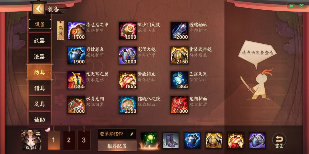 这里提供了三套装备方案,第一套辅助装使用浅草萤光,可以为平常回复血量和法力, 第二套辅助装使用空岚之境,可以为队友提供二秒的护盾,适时使用可以保住队友, 第三套辅助装如果敌方无法师或敌方法师弱势时可以使用