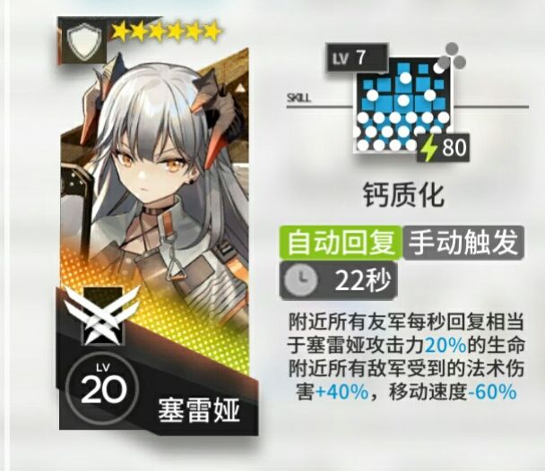 精二技能:钙质化简直是神技,七级技能减速60%,加深40%法术伤害,并且每秒回20%攻击的血量,持续22秒,搭配天赋回血的同时还能回技力,个人认为是绝对能担任主坦的干员,与星熊各有胜场,甚至泛用性更高。