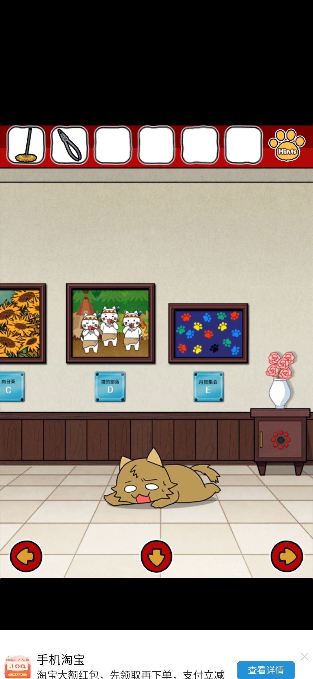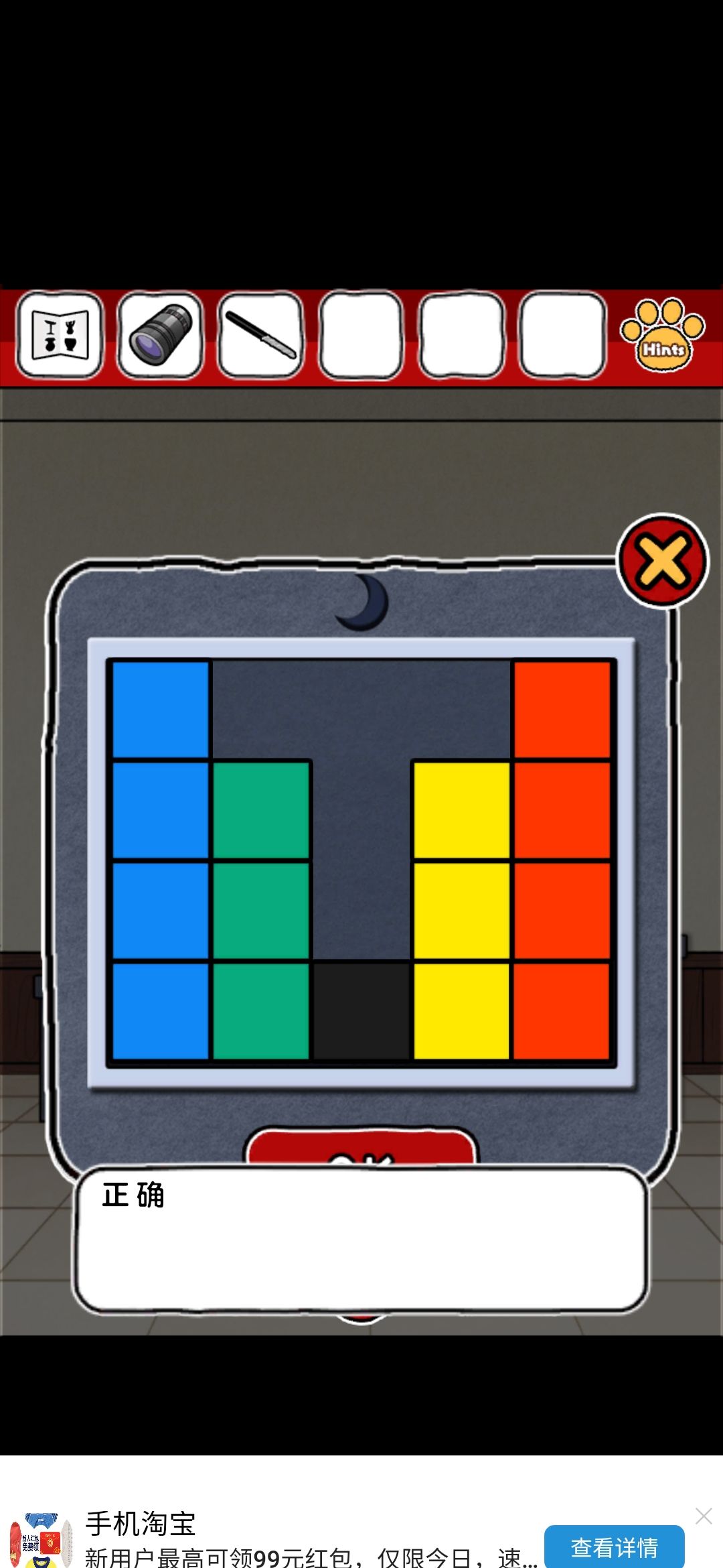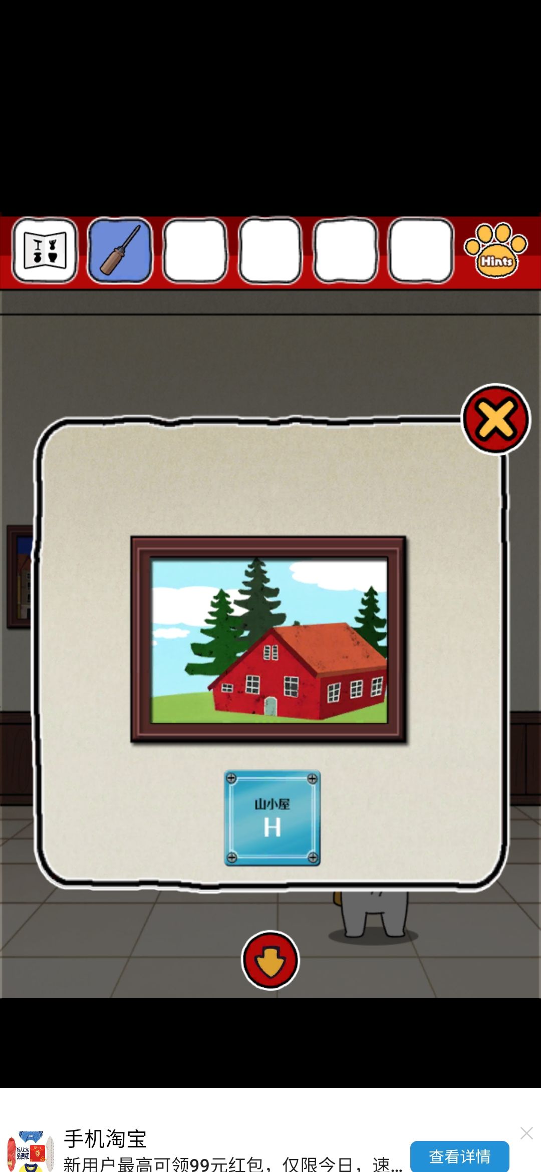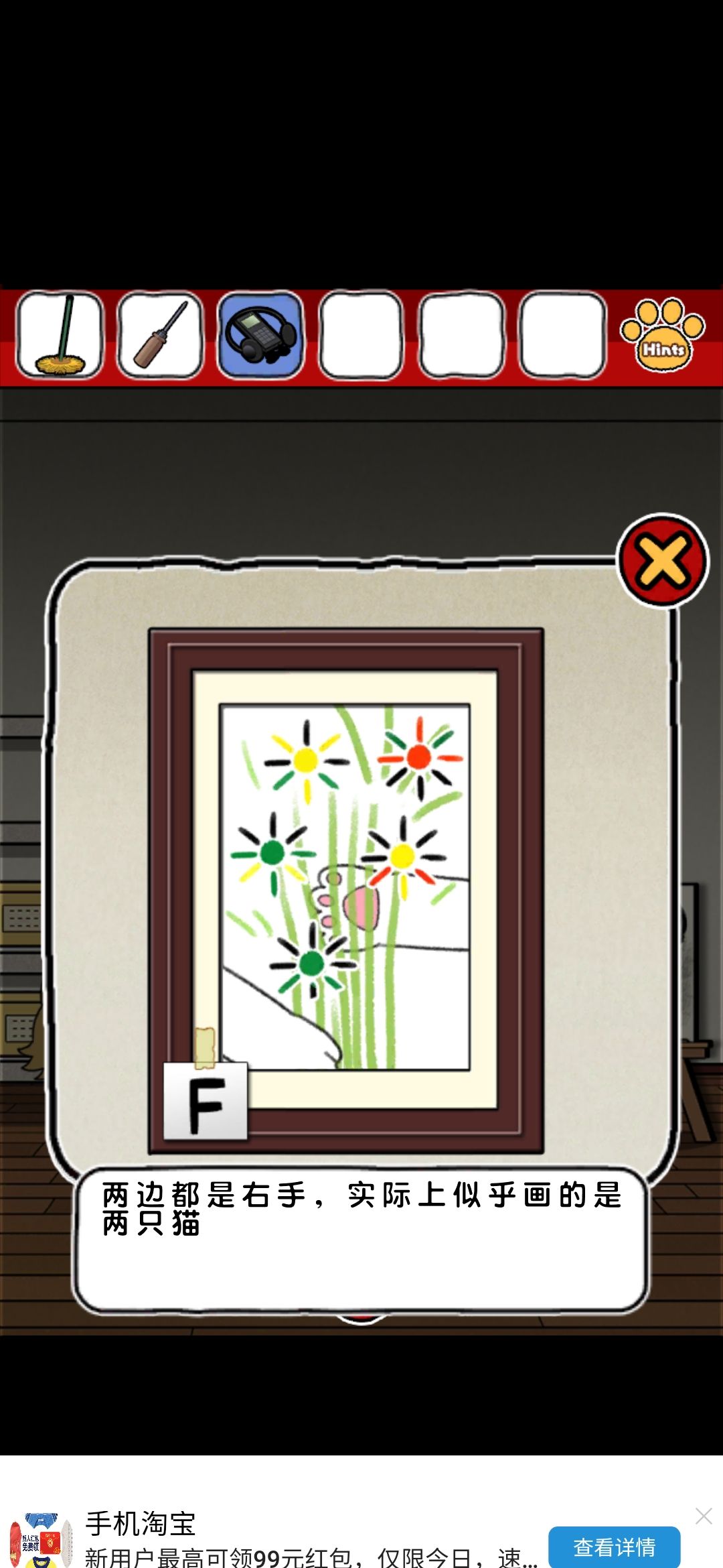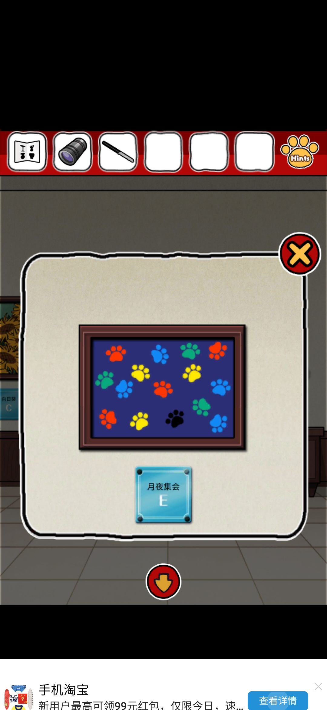 评价:emmm整体画风我还是比较喜欢的,可爱中带着丝丝沙雕,难度系数不太大,就是个别点,需要非常细心才行,比如那个我心心念念却和我擦眼而过无数次的钳子,比如那个玫瑰下面的柜子O,还有那个那个拿狗粮的环节,(这个其实还好吧,就是当时一直以为密码只有红色,不太明白黄绿是干什么的233)除此之外也没啥特别难的了~而且还有免费的提示,实在找不到线索也可以看一下,也有看广告能直接拿到答案的~我就用了两次,有没有限制次数我也不清楚~满分制5分的话,打分4.7吧,扣分点大概就是,有点简单233,没啥太大难度,而且有点短小,不太过瘾,刚起兴就完了,希望能多做点~(顺便小声逼逼,我真的太喜欢这种简单粗暴没啥太多剧情的游戏了