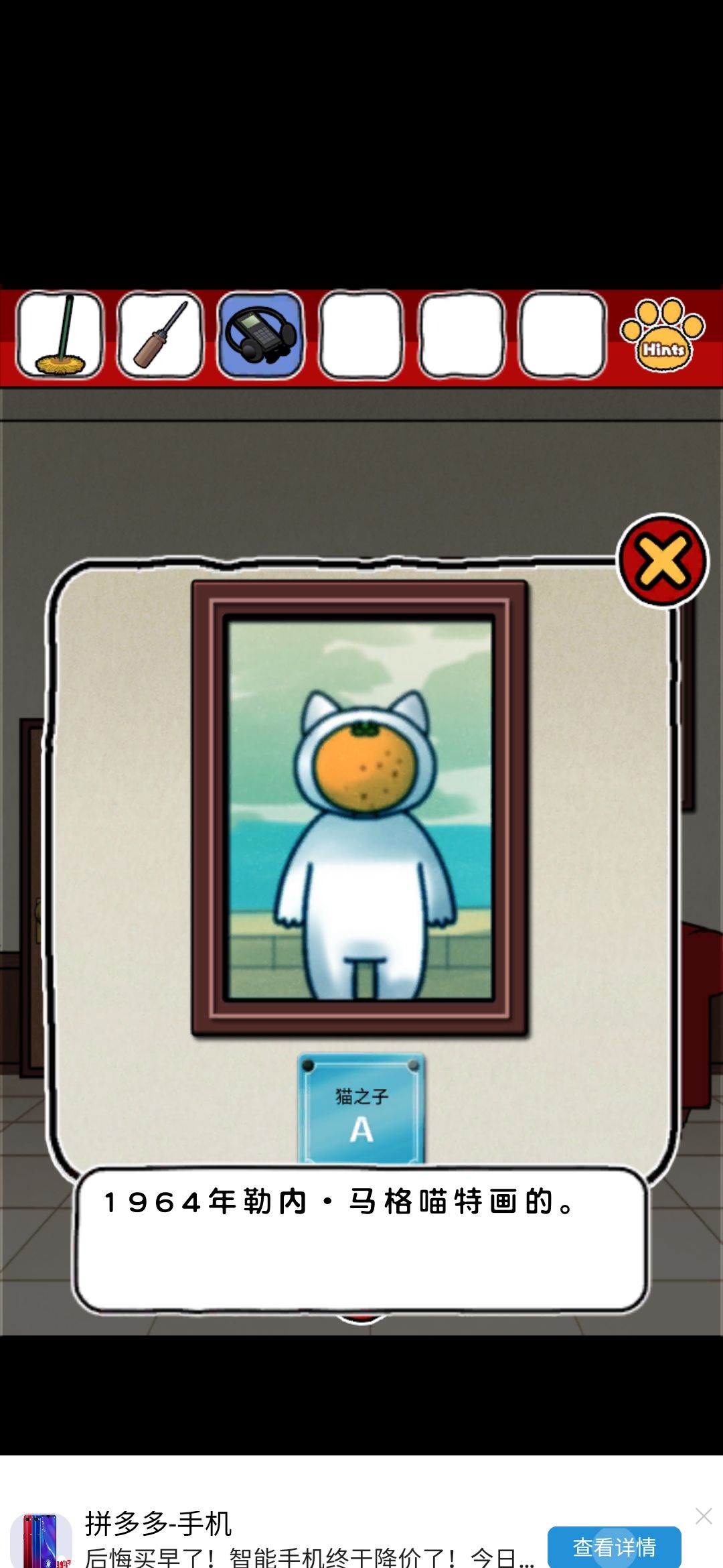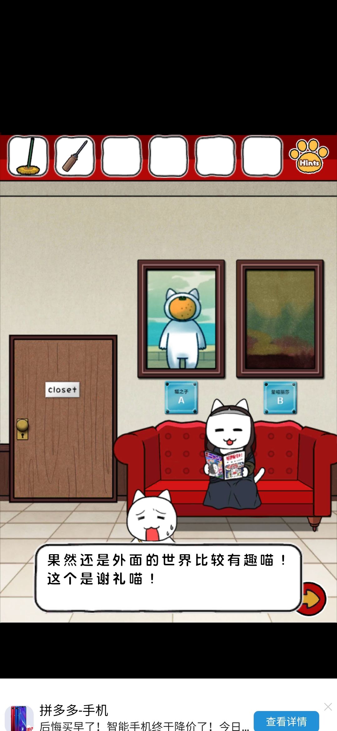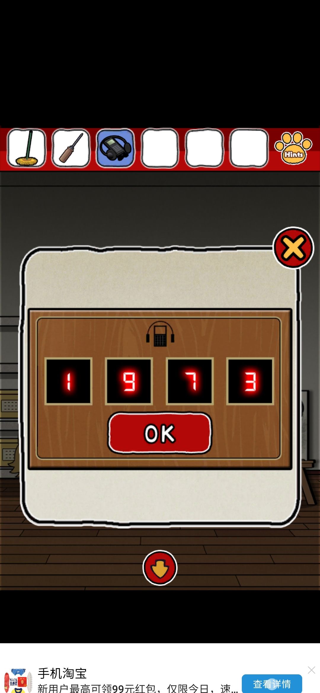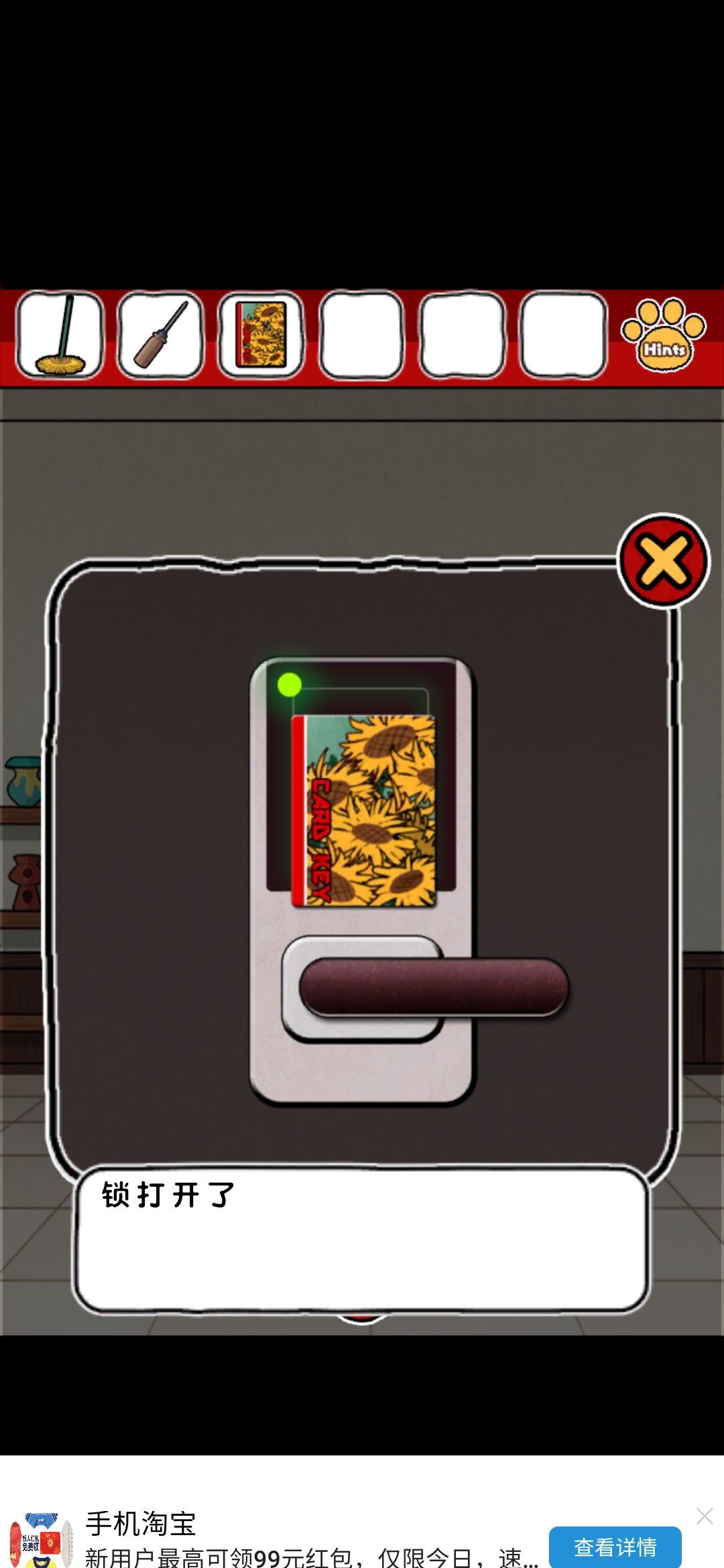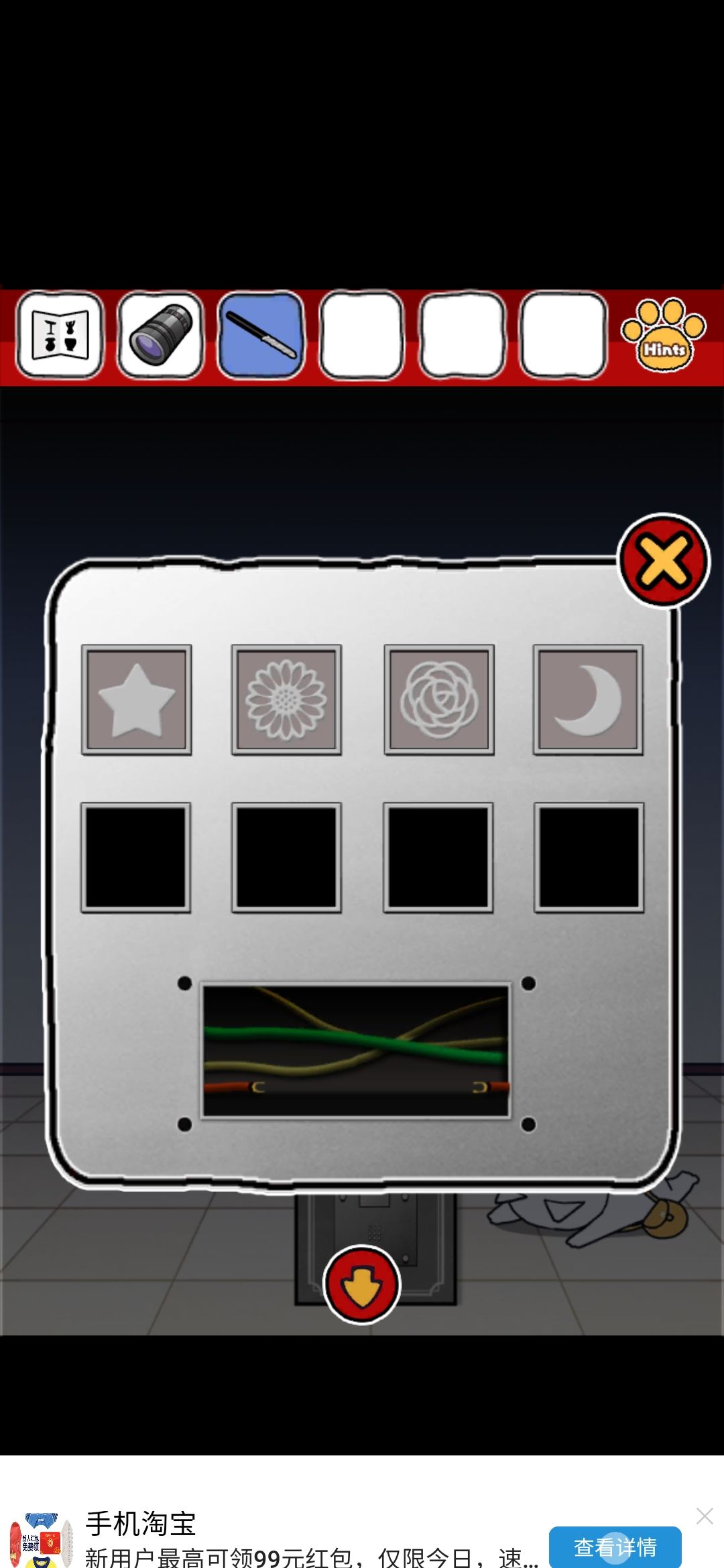 评价:emmm整体画风我还是比较喜欢的,可爱中带着丝丝沙雕,难度系数不太大,就是个别点,需要非常细心才行,比如那个我心心念念却和我擦眼而过无数次的钳子,比如那个玫瑰下面的柜子O,还有那个那个拿狗粮的环节,(这个其实还好吧,就是当时一直以为密码只有红色,不太明白黄绿是干什么的233)除此之外也没啥特别难的了~而且还有免费的提示,实在找不到线索也可以看一下,也有看广告能直接拿到答案的~我就用了两次,有没有限制次数我也不清楚~满分制5分的话,打分4.7吧,扣分点大概就是,有点简单233,没啥太大难度,而且有点短小,不太过瘾,刚起兴就完了,希望能多做点~(顺便小声逼逼,我真的太喜欢这种简单粗暴没啥太多剧情的游戏了