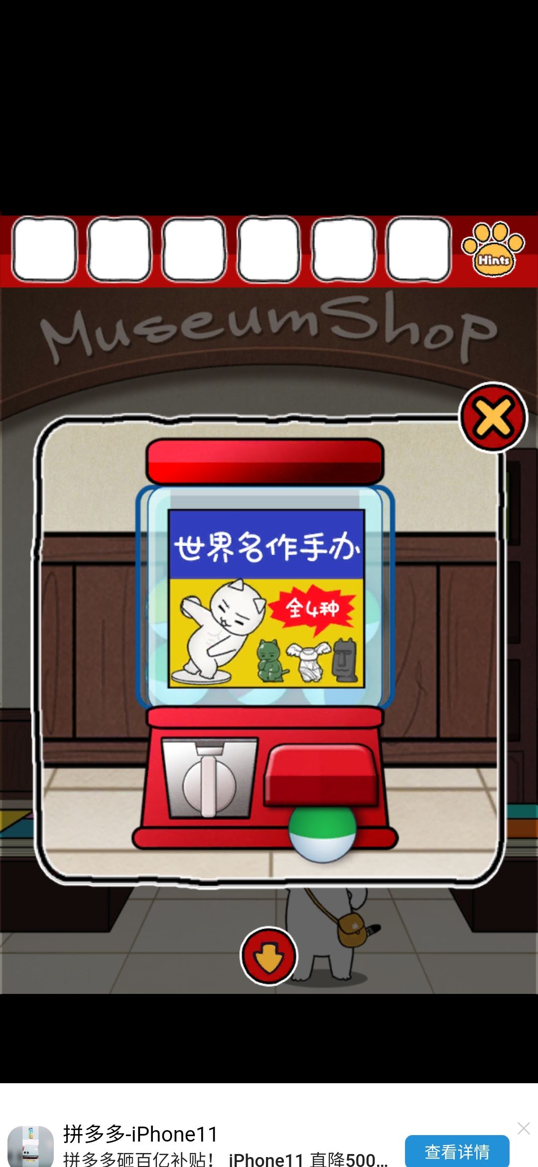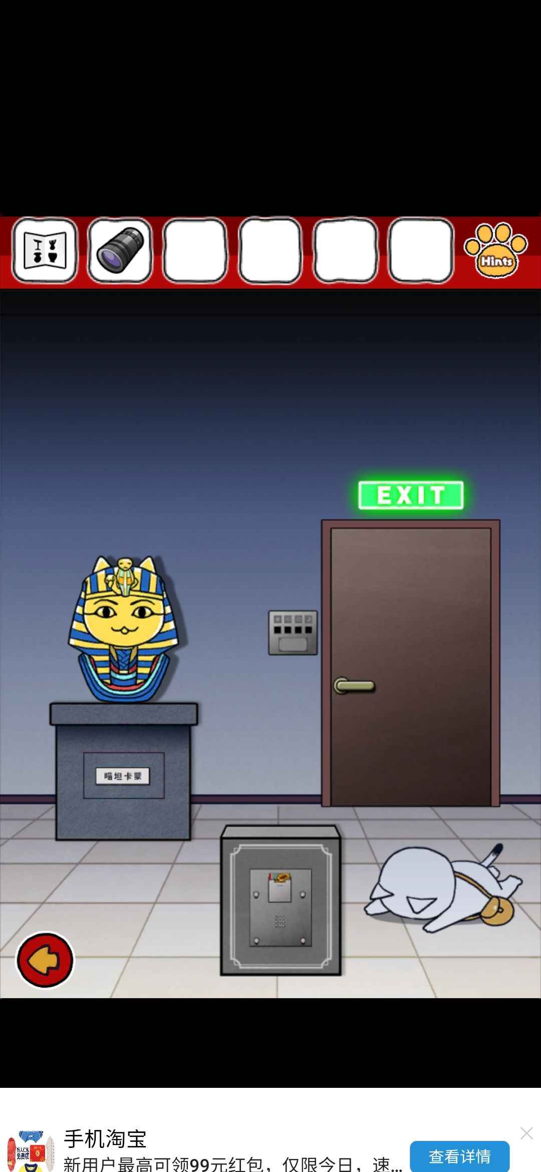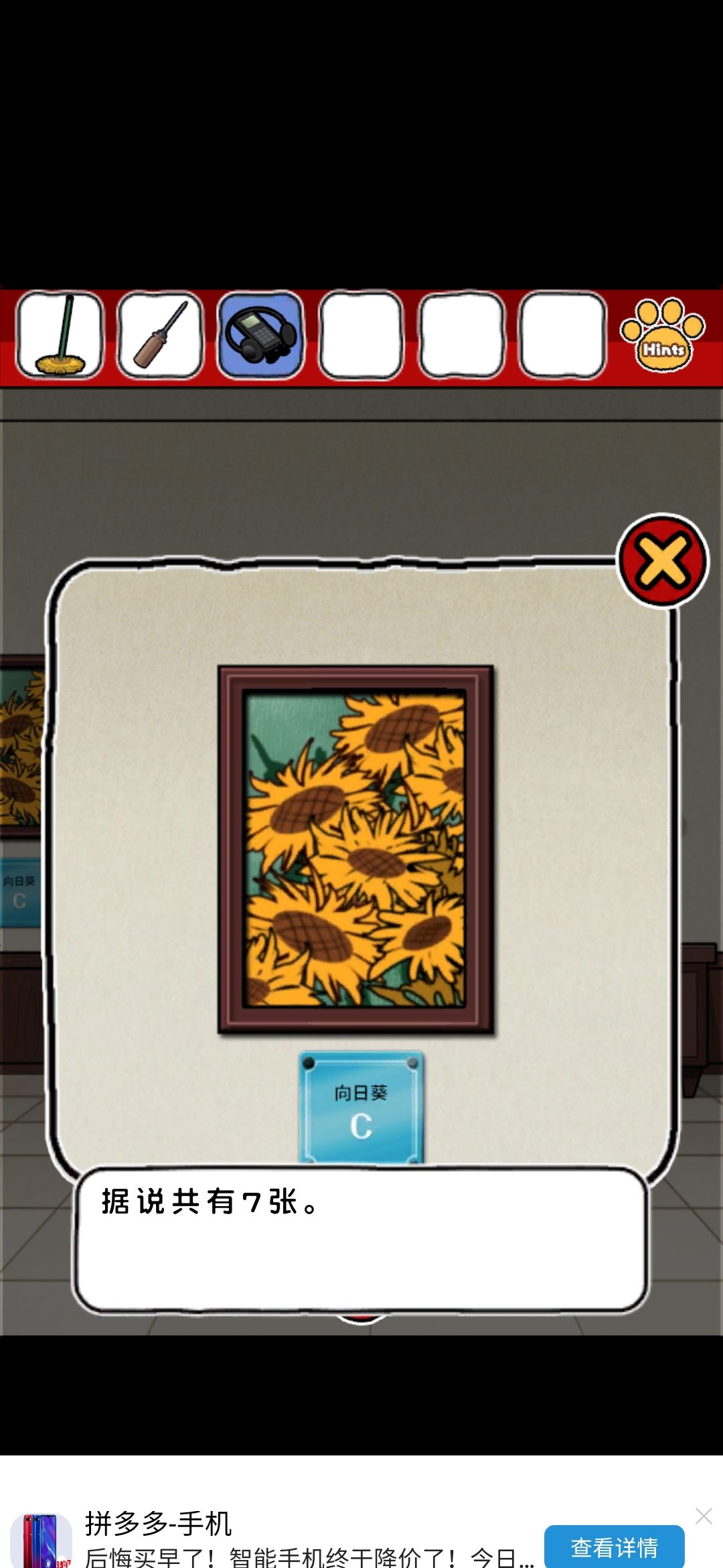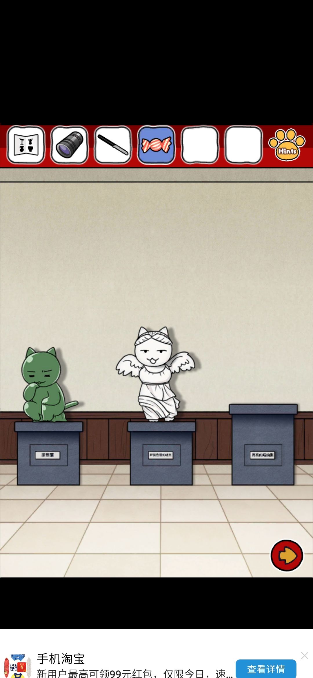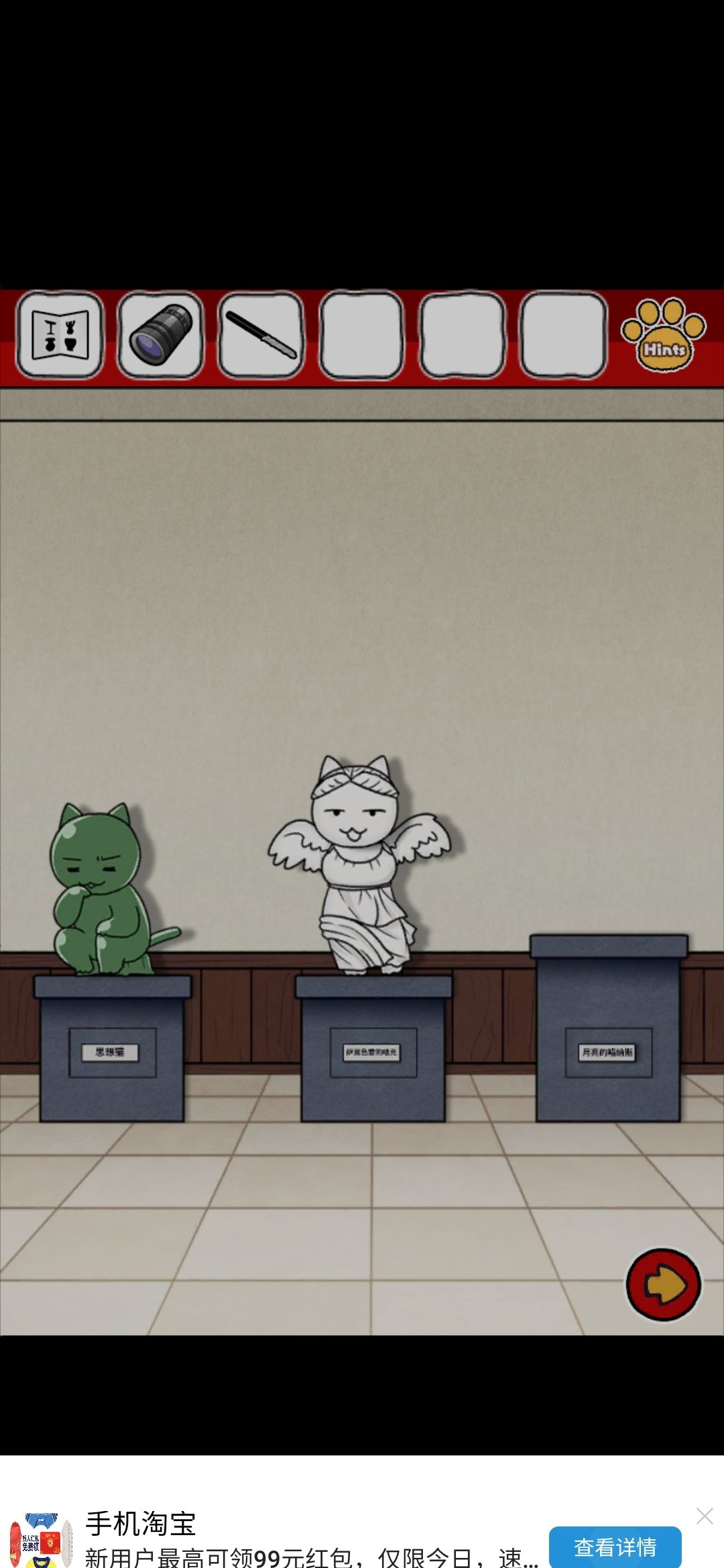 带着这个胶,去粘那个笑到头掉的雕像,给它粘好(先用胶抹脖子上,再点头就完事啦!),头原来的展示台上的密码要用到之前的画,数爪子颜色就行了,密码43134