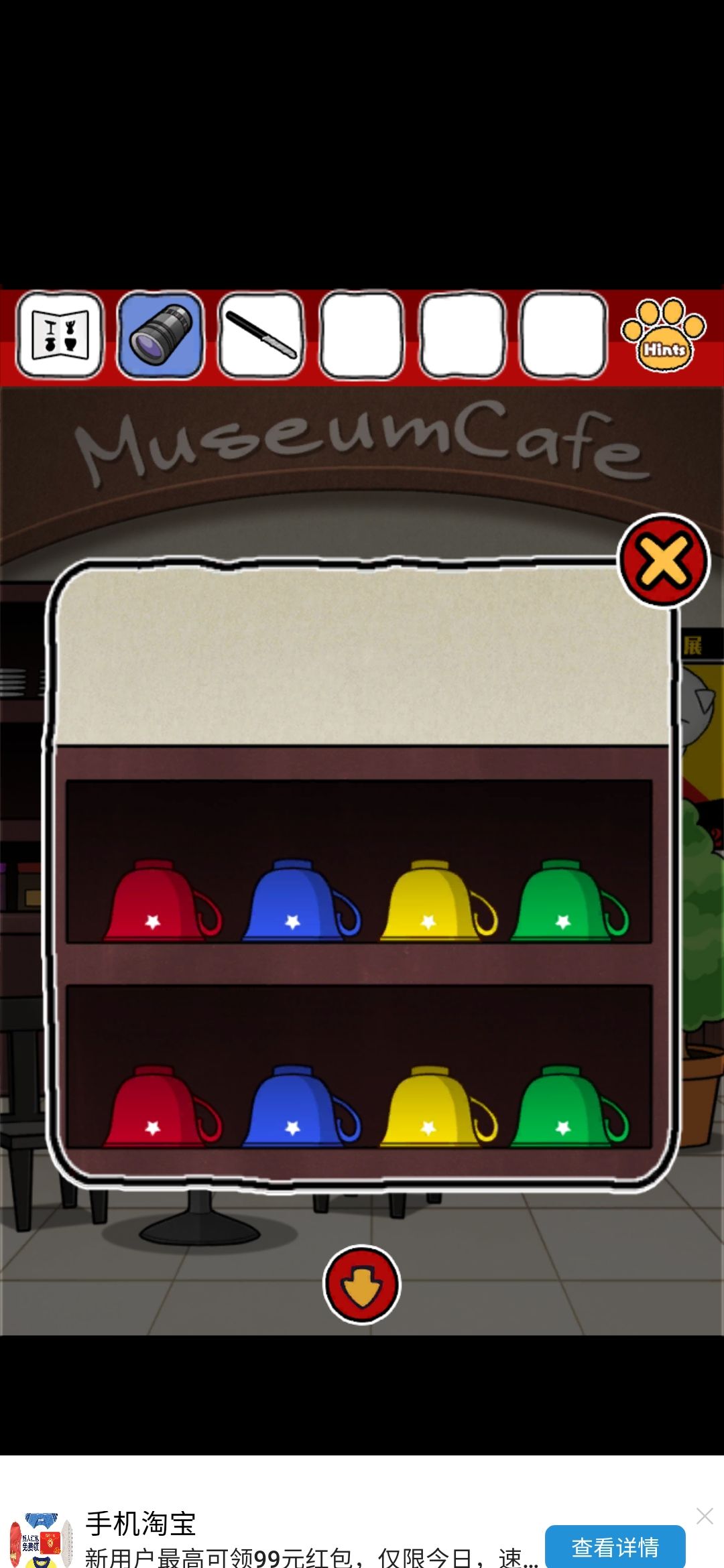 这个时候,再次返回cafe场景的书架上,对着顺序,知道密码是蓝黄蓝黄,再去shop场景的如图书后输入密码,会给你个什么胶