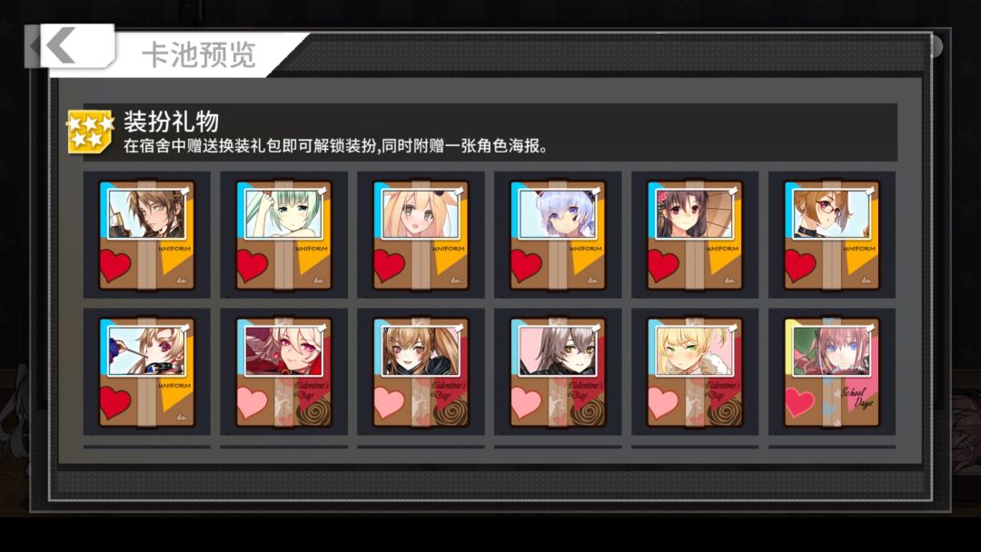 黑卡:在你已经赠送(或拥有多个)同一个人形的同一款换装后,再次赠送对应人形对应的重复换装即可获得一张黑卡(并且仍然获得对应的海报)。